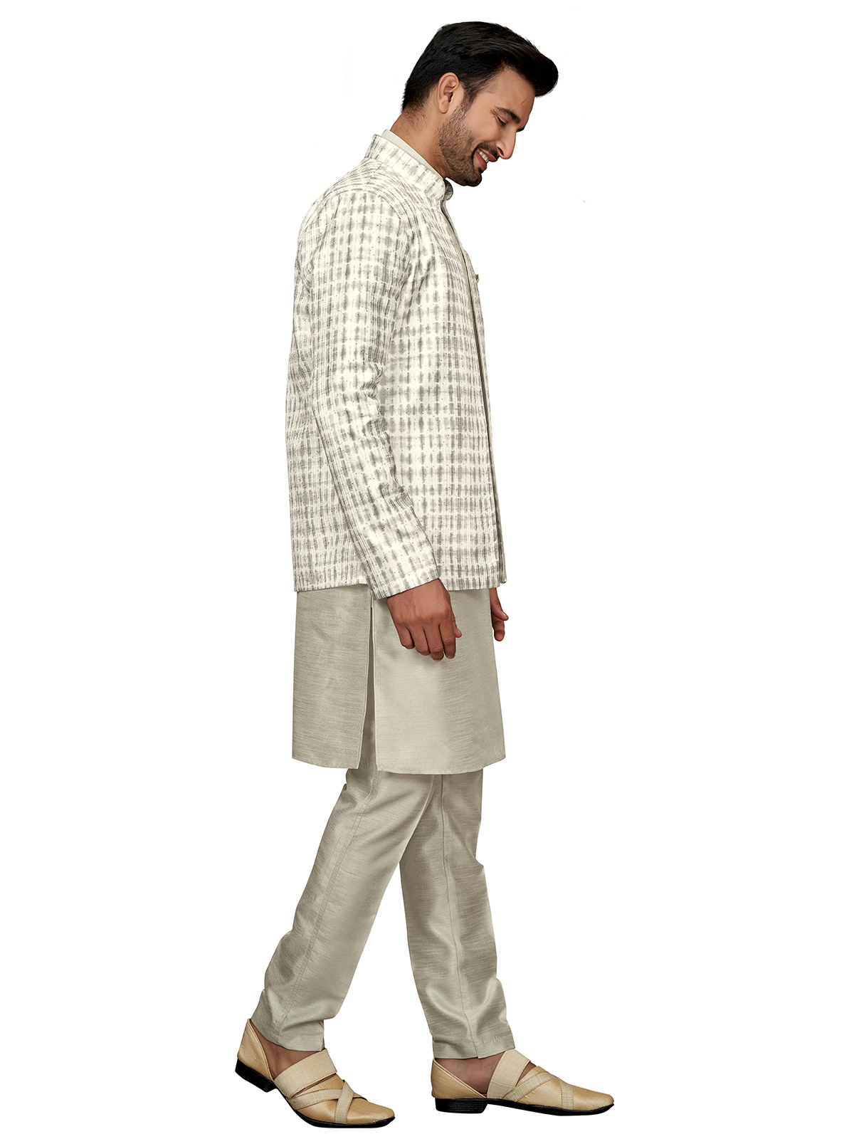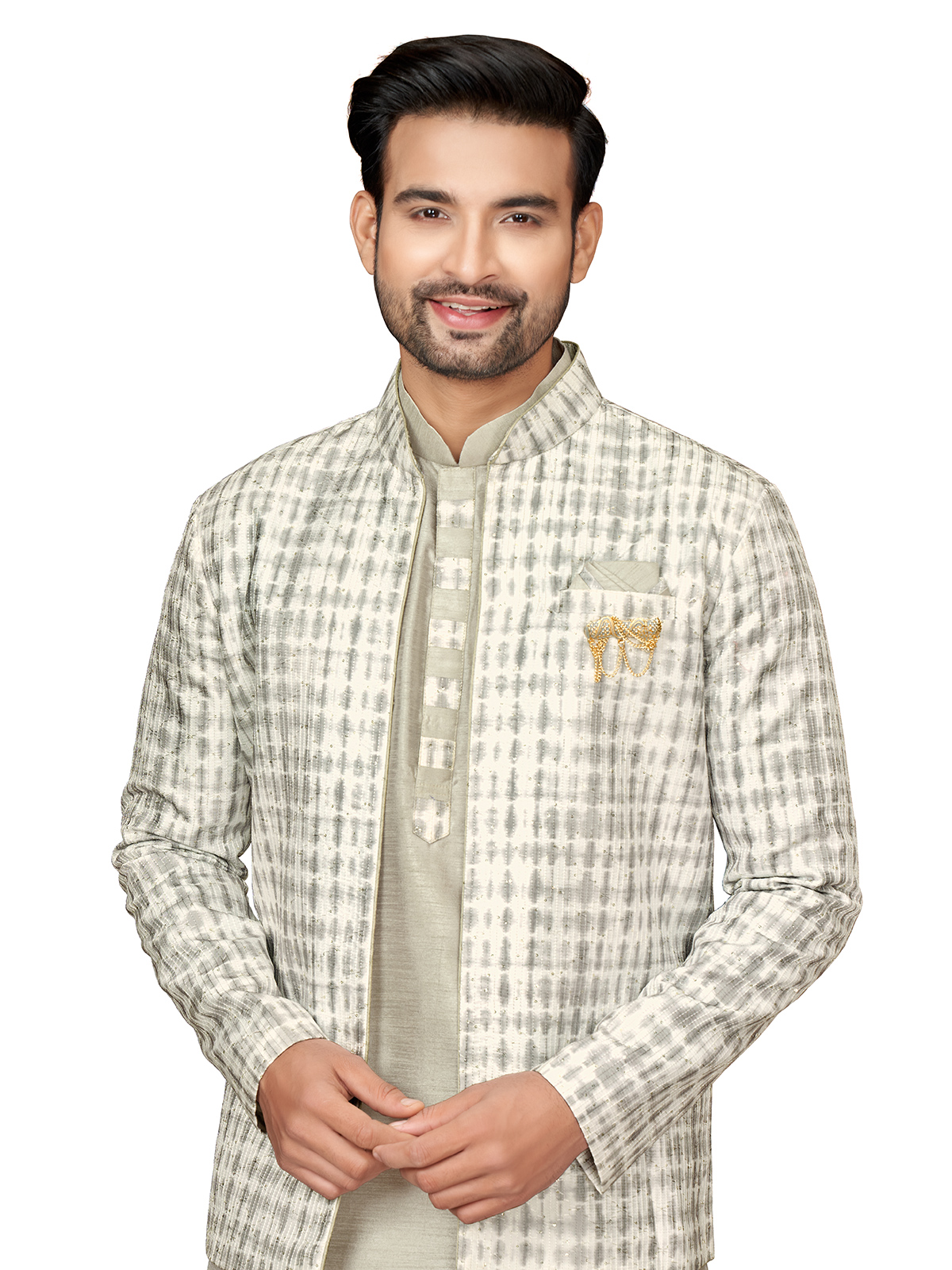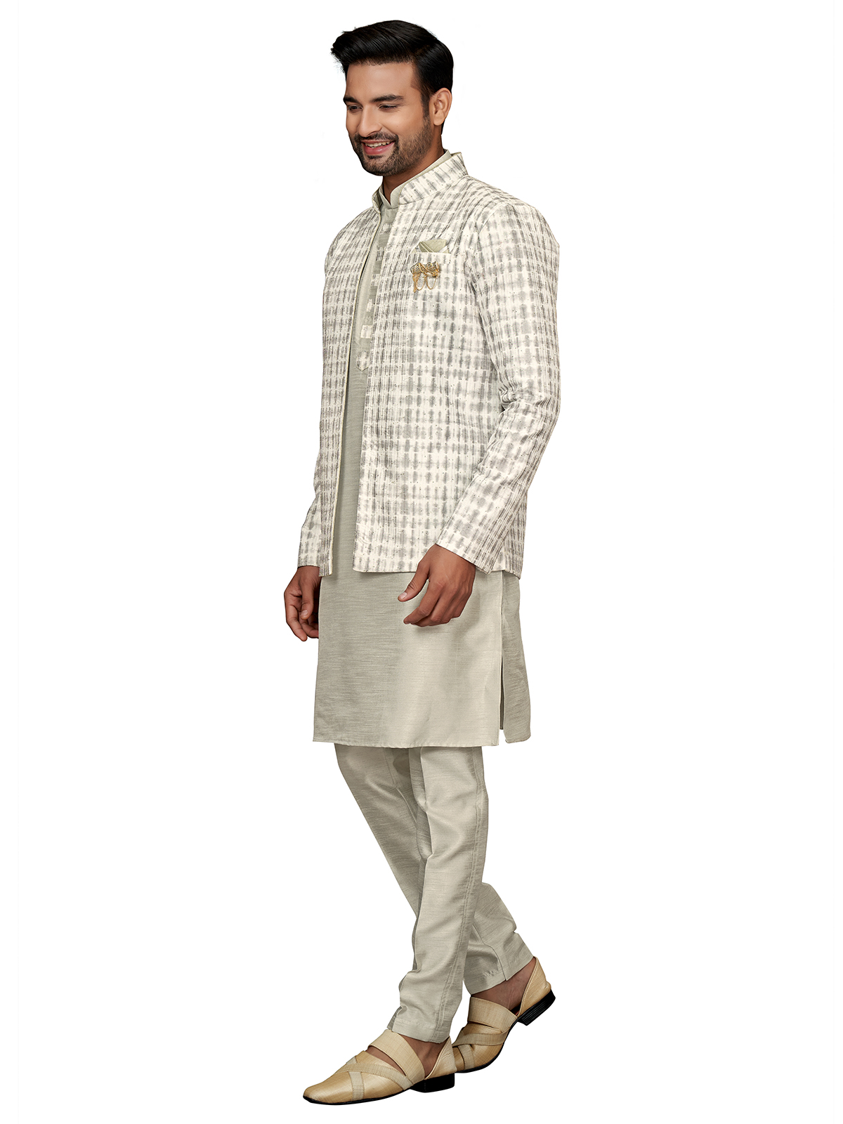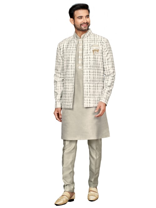 Printed Grey Silk Indowestern For Weddings