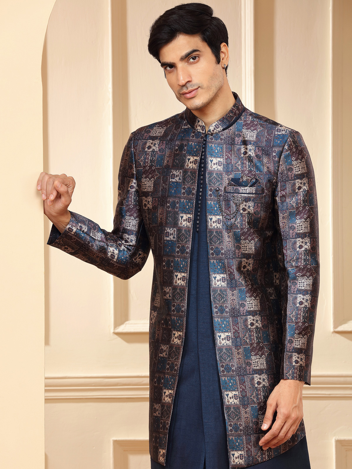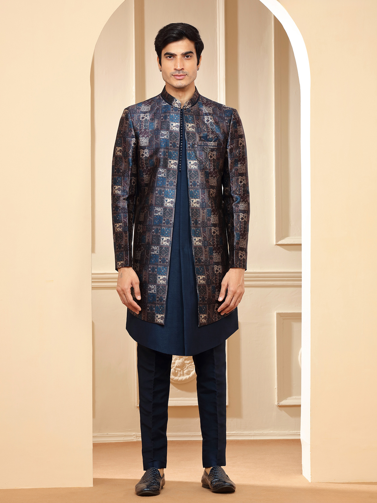 Make heads turn in our classy teal blue raw silk indowestern, featuring a striking printed pattern that guarantees compliments. Paired with coordinating bottoms for a polished look.