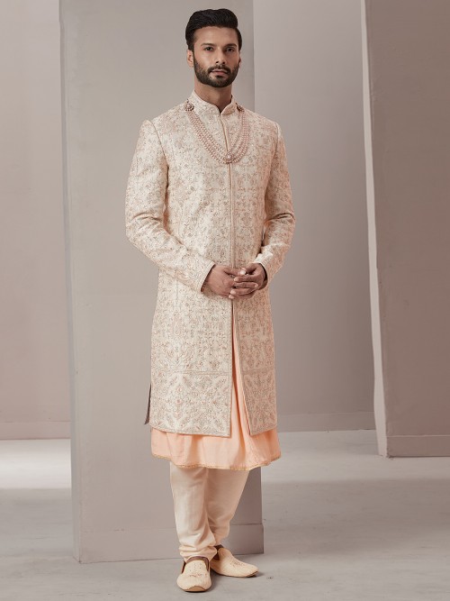 Raw Silk Light Peach Groom And Wedding Sherwani