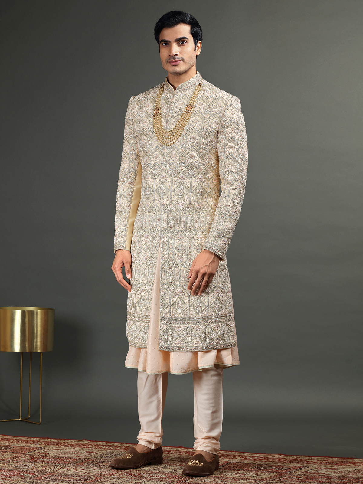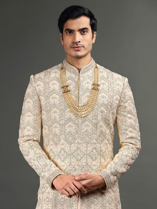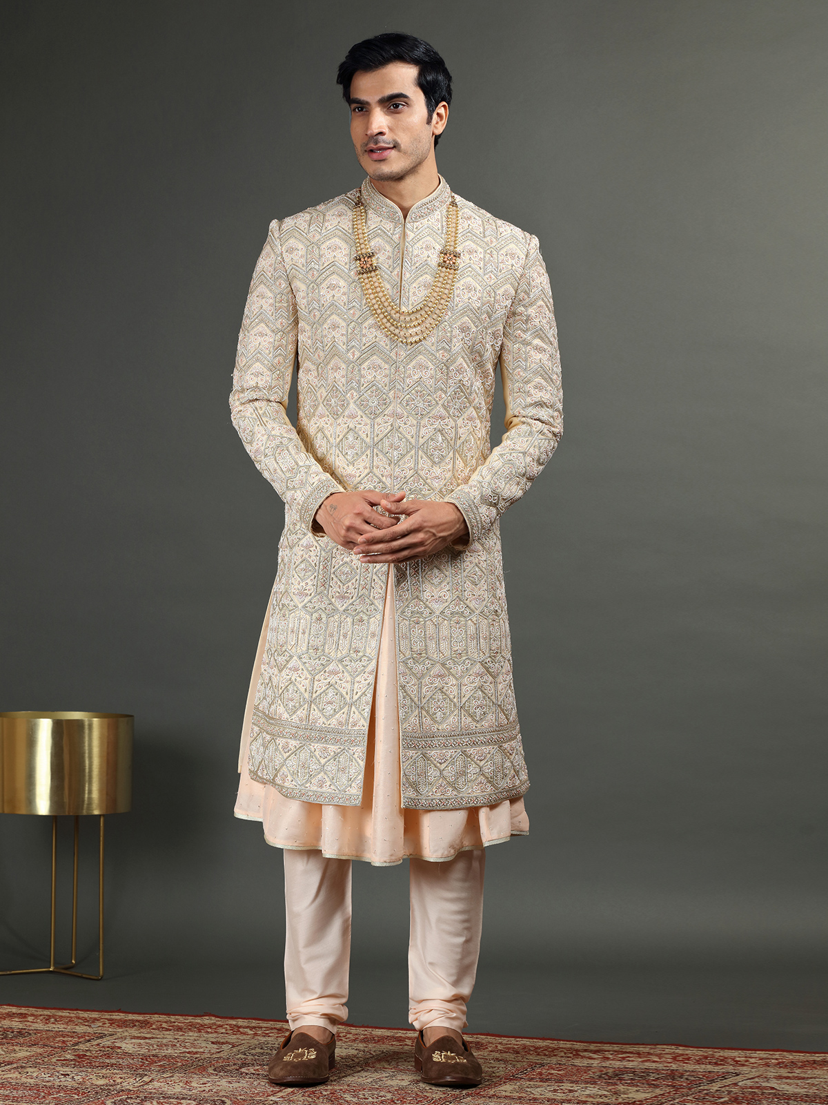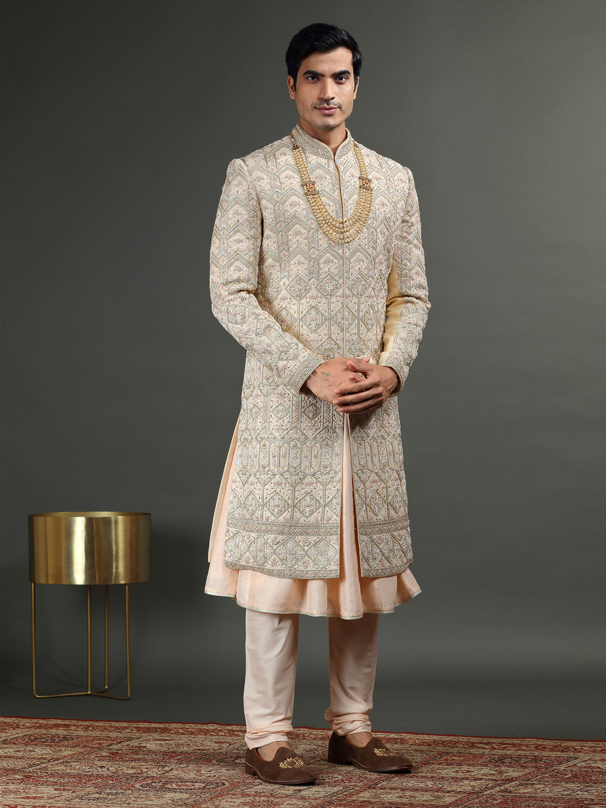 Discover the best wedding wear in a peach and beige raw silk sherwani, featuring embroidery, resham, cutdana, sequins, zardosi and beads work, accompanied by a bottom.