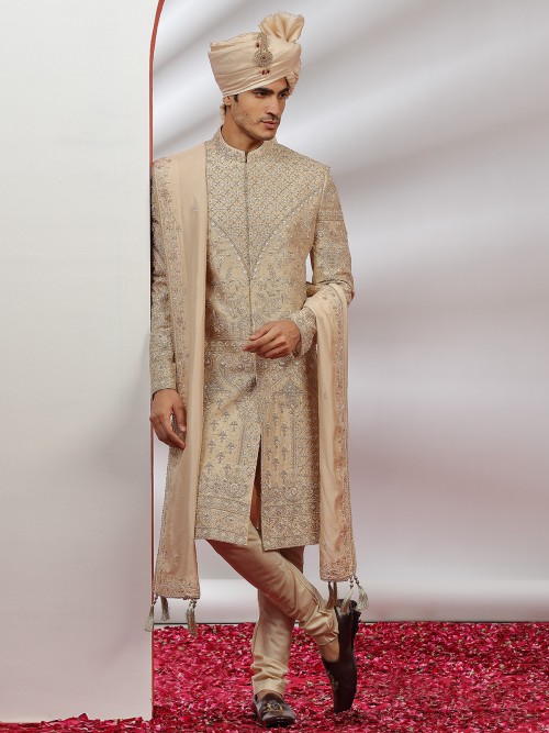 Get ready for the baraat with an exclusive wedding collection that features beige raw silk sherwani for men with intricate embroidery, sequins, resham, beads, cutdana, and zardosi work that adds an extra touch of elegance. The sherwani has a stand collar, full button placket, full sleeves, and a straight vented hem. It comes with a bottom and is the perfect ensemble for the groom.