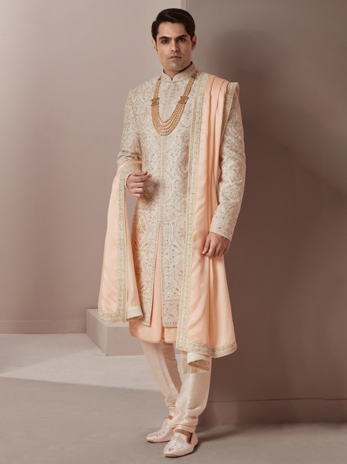 Indian weddings are known for their traditional attire with modern designs. The groom collection is tailored with creative craftsmanship to perfection and delivered to your doorstep. This peach raw silk sherwani is embellished with embroidered, resham, sequins, zardosi, and beads work overall. It has a stand collar, full button placket, full sleeves, and a straight vented hem. It comes with a bottom.