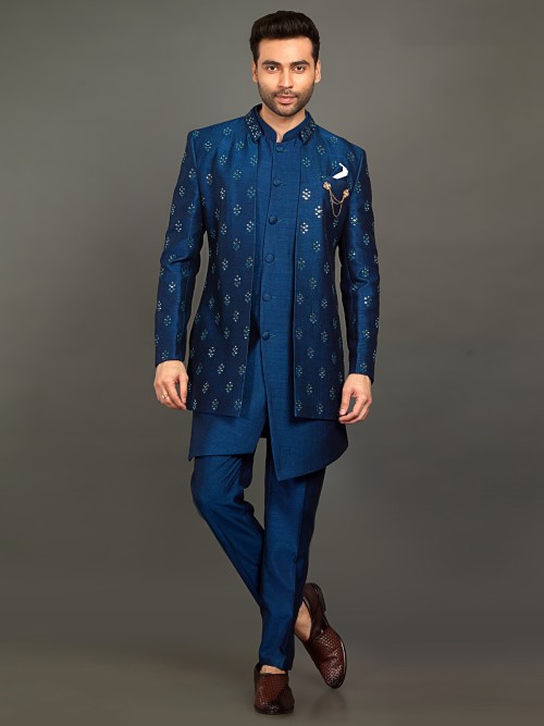 Impress everyone with this royal blue cotton silk indowestern perfect for weddings and parties. Embellished with resham, mirror, and embroidered work throughout the attire. Featuring a stand collar, full button placket, full sleeves, welt pocket with tie, and vented hemline. Comes with bottom.