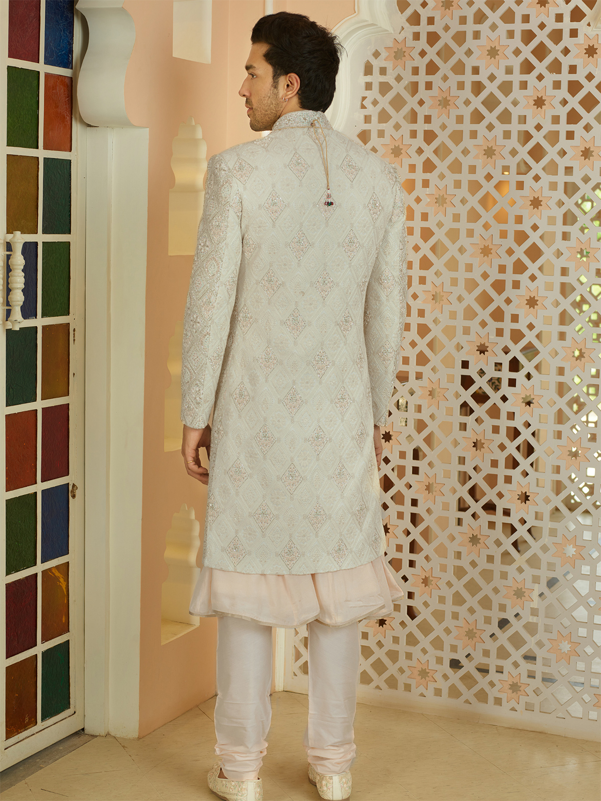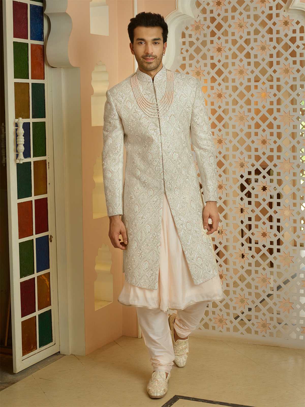 If you are too picky about sherwani and want a twist of extremely royal and smart look, this cream silk sherwani is perfect pick for your spacial day. Enhance with cutdana, sequins, beads, resham and zardosi work that gives you a rocking look.