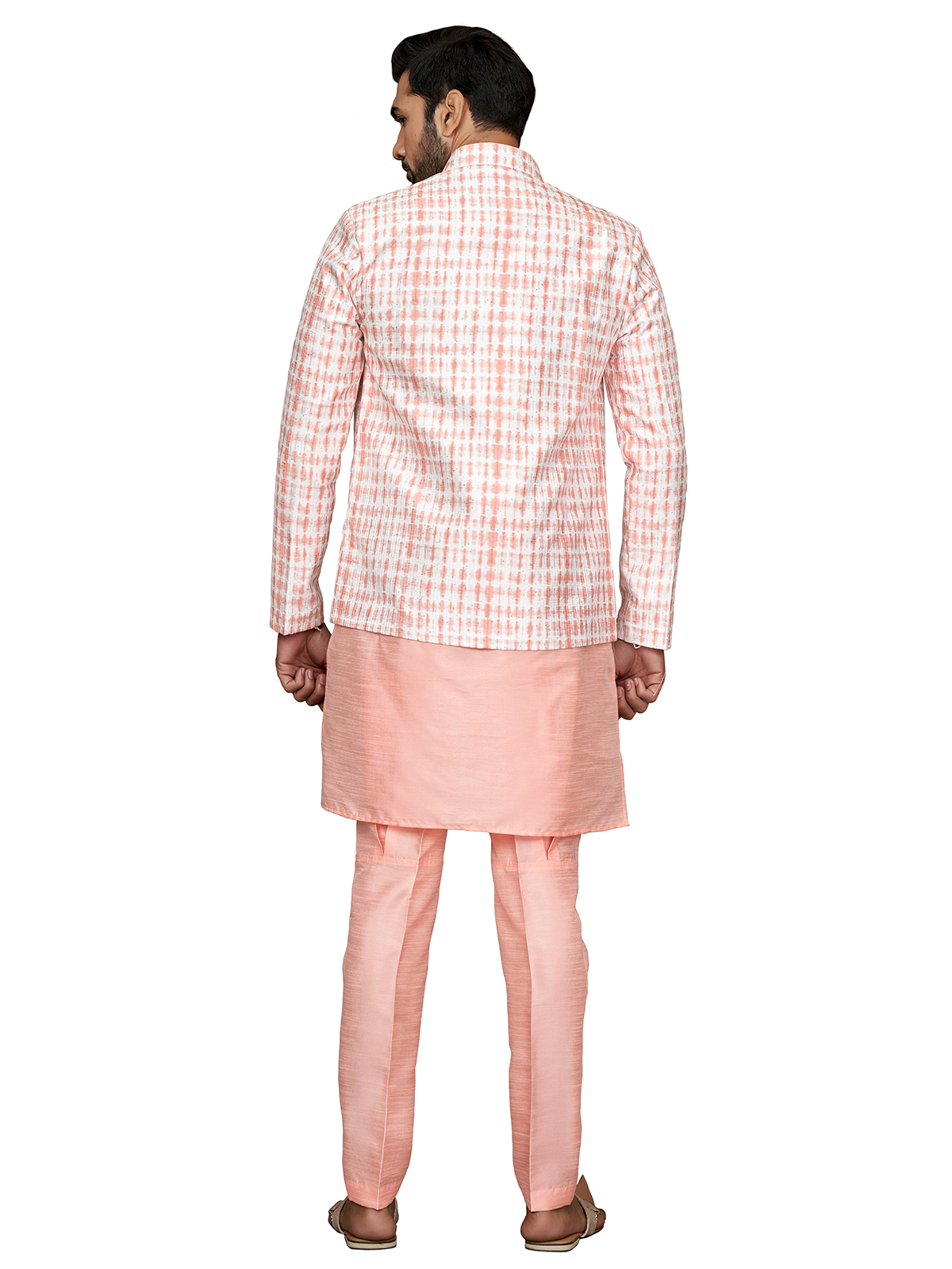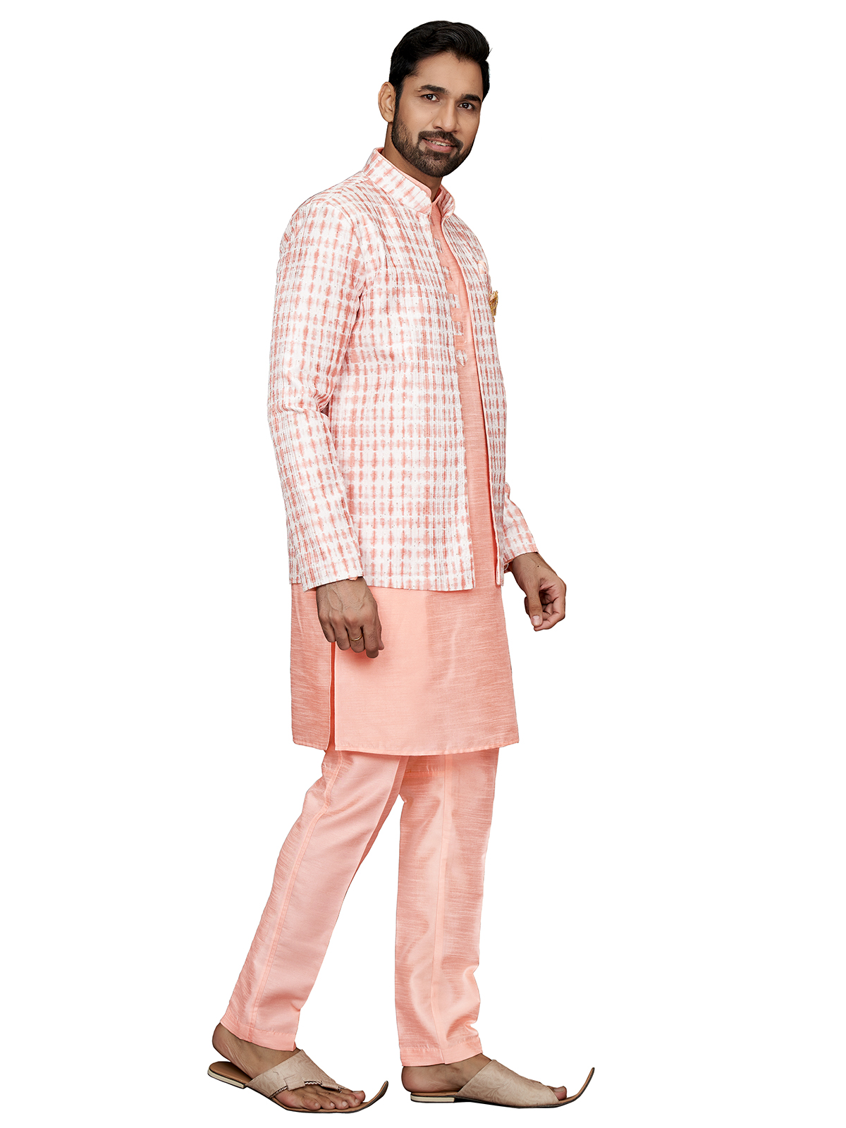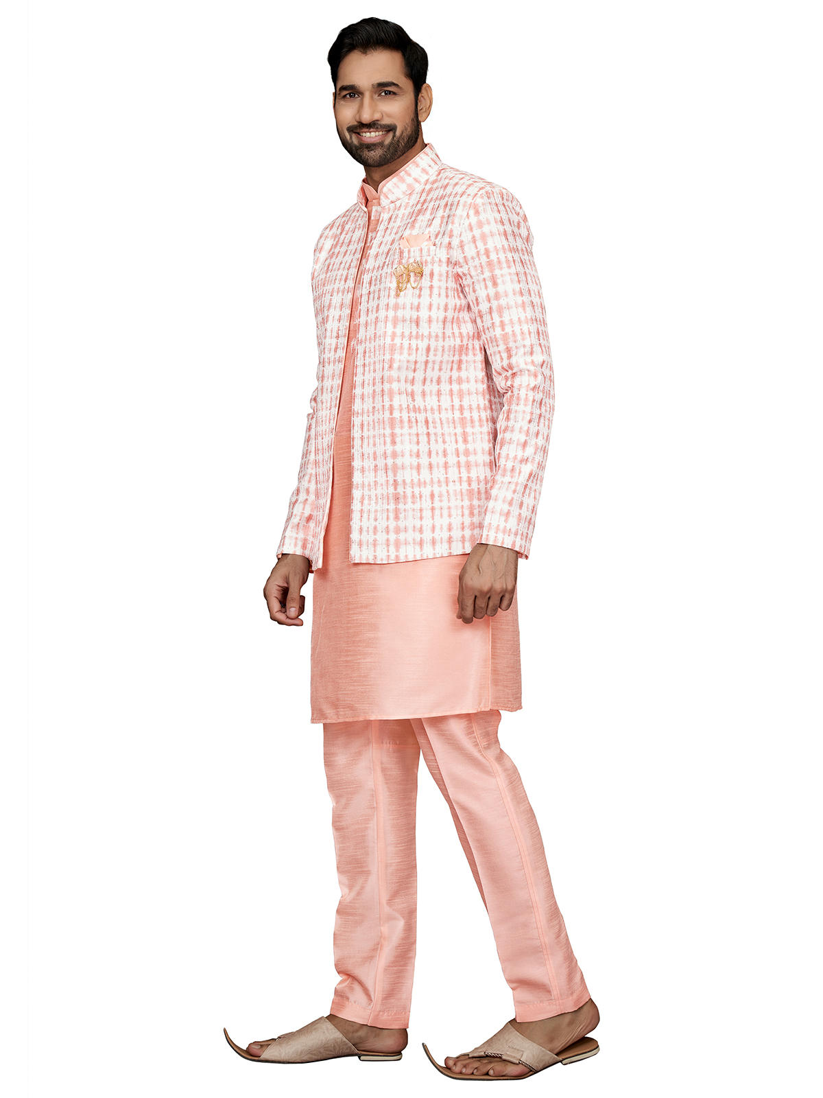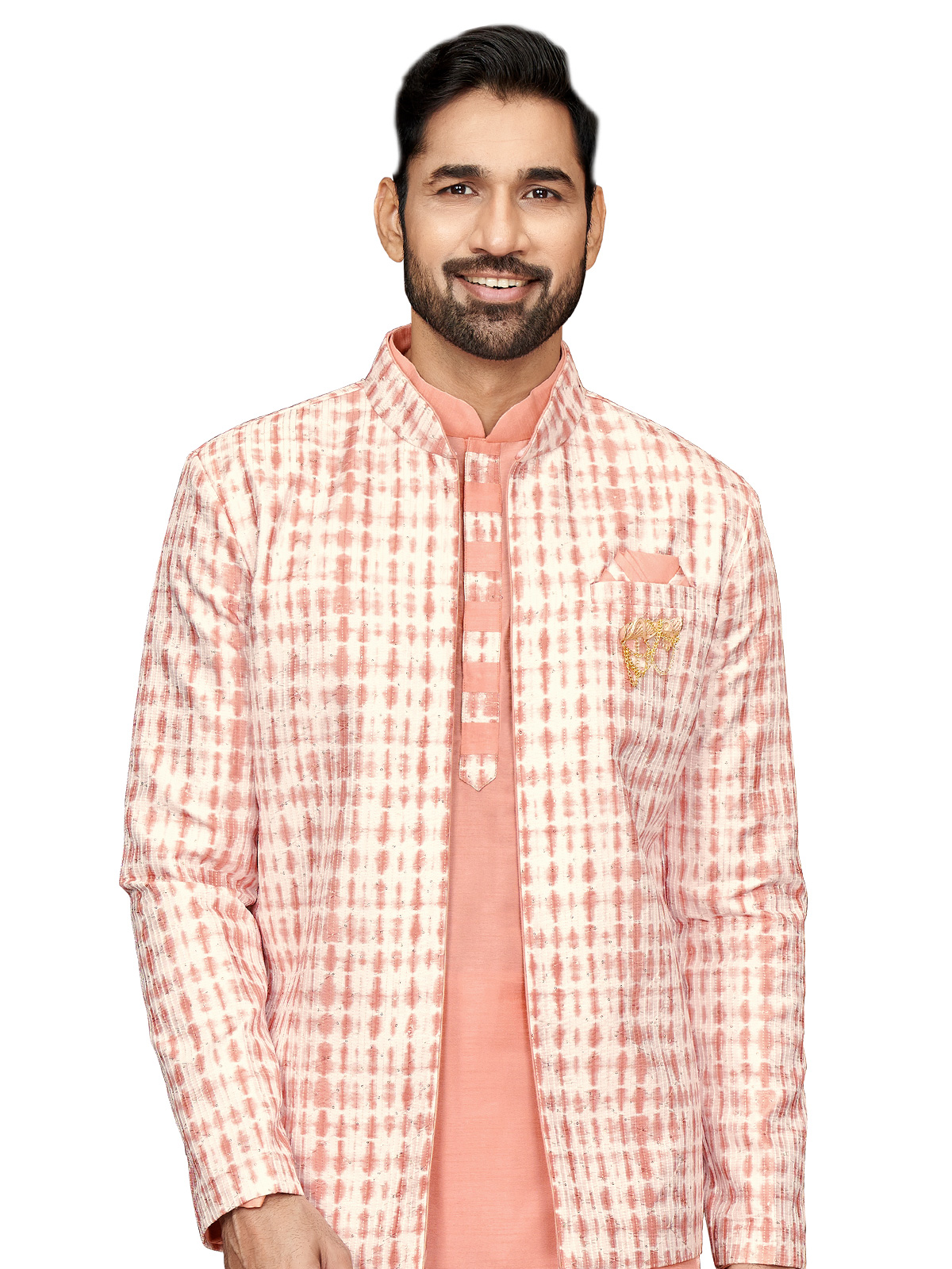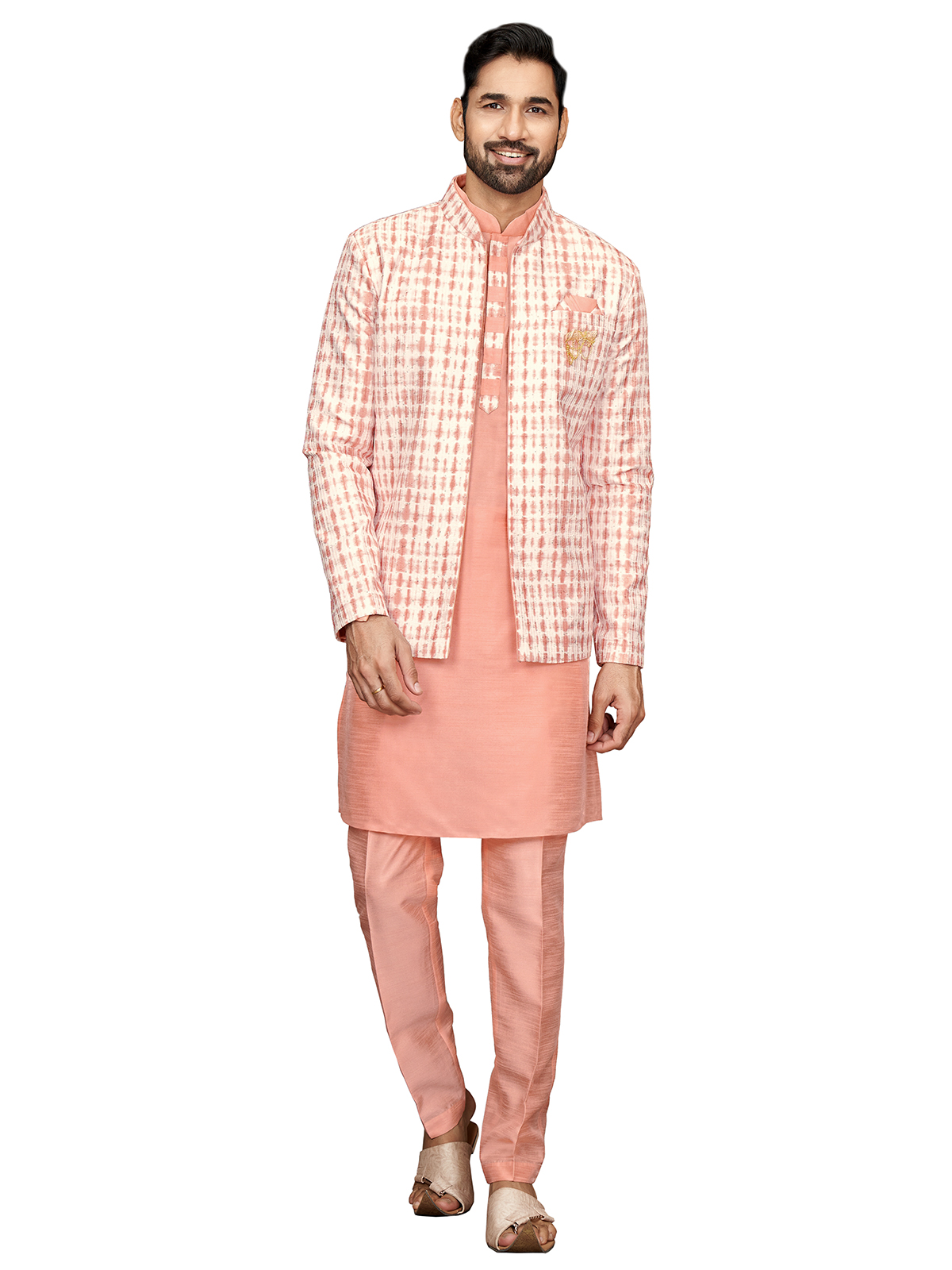 Add a pop of color to your wedding attire with this peach printed silk indowestern. Featuring a mandarin collar, full sleeves, a welt pocket with pocket tie, and a full buttoned placket. It comes with a bottom.