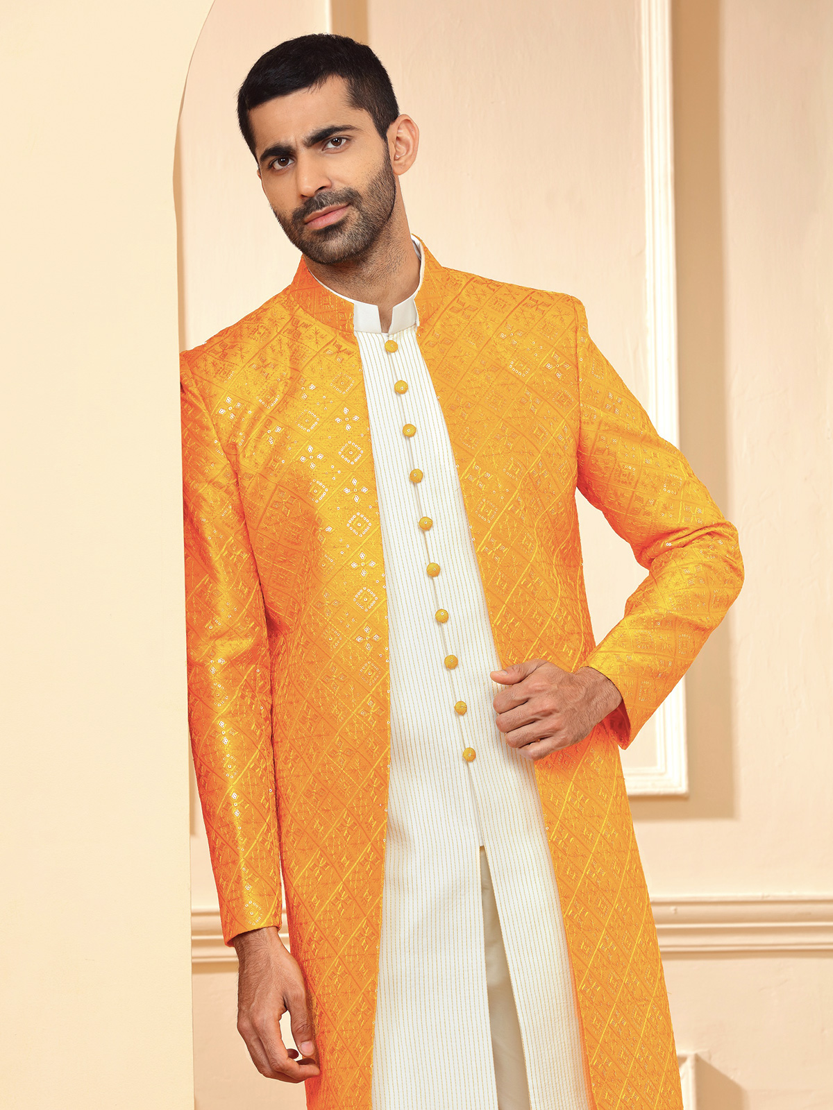 Shop our white and orange silk Indowestern, designed for reception celebrations. The intricate embroidery and sequins work elevate the outfits appeal, and it comes with a bottom.