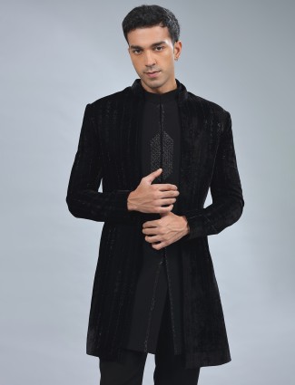 Elevate your style while embracing sustainability with this black velvet Indowestern, perfect for receptions. The captivating cutdana and resham work make it a truly remarkable choice, accompanied by a bottom.