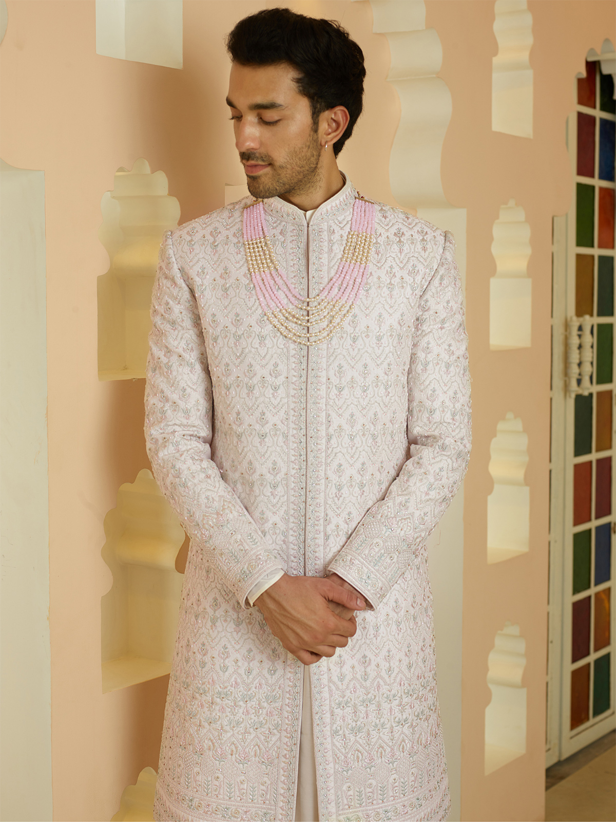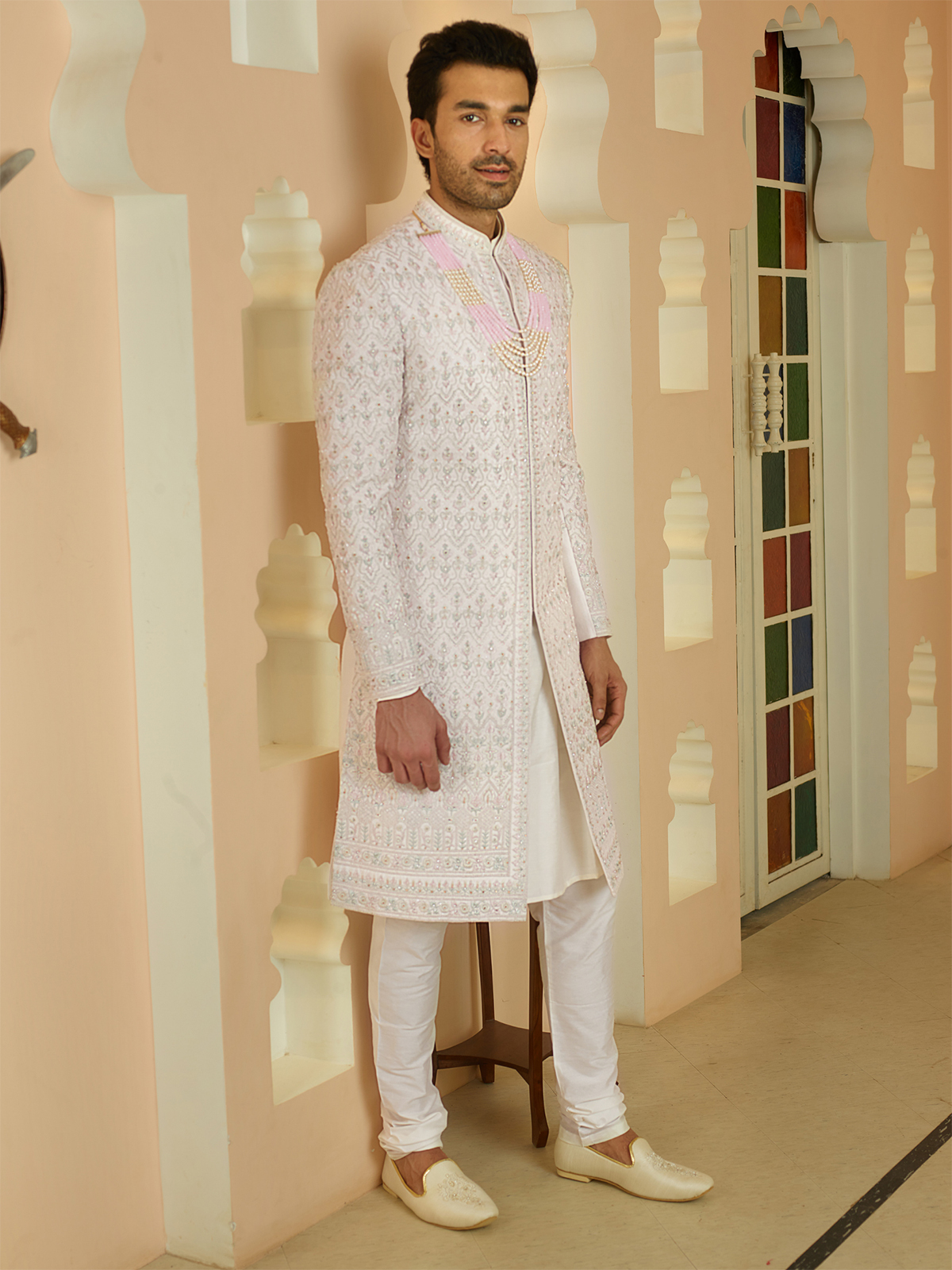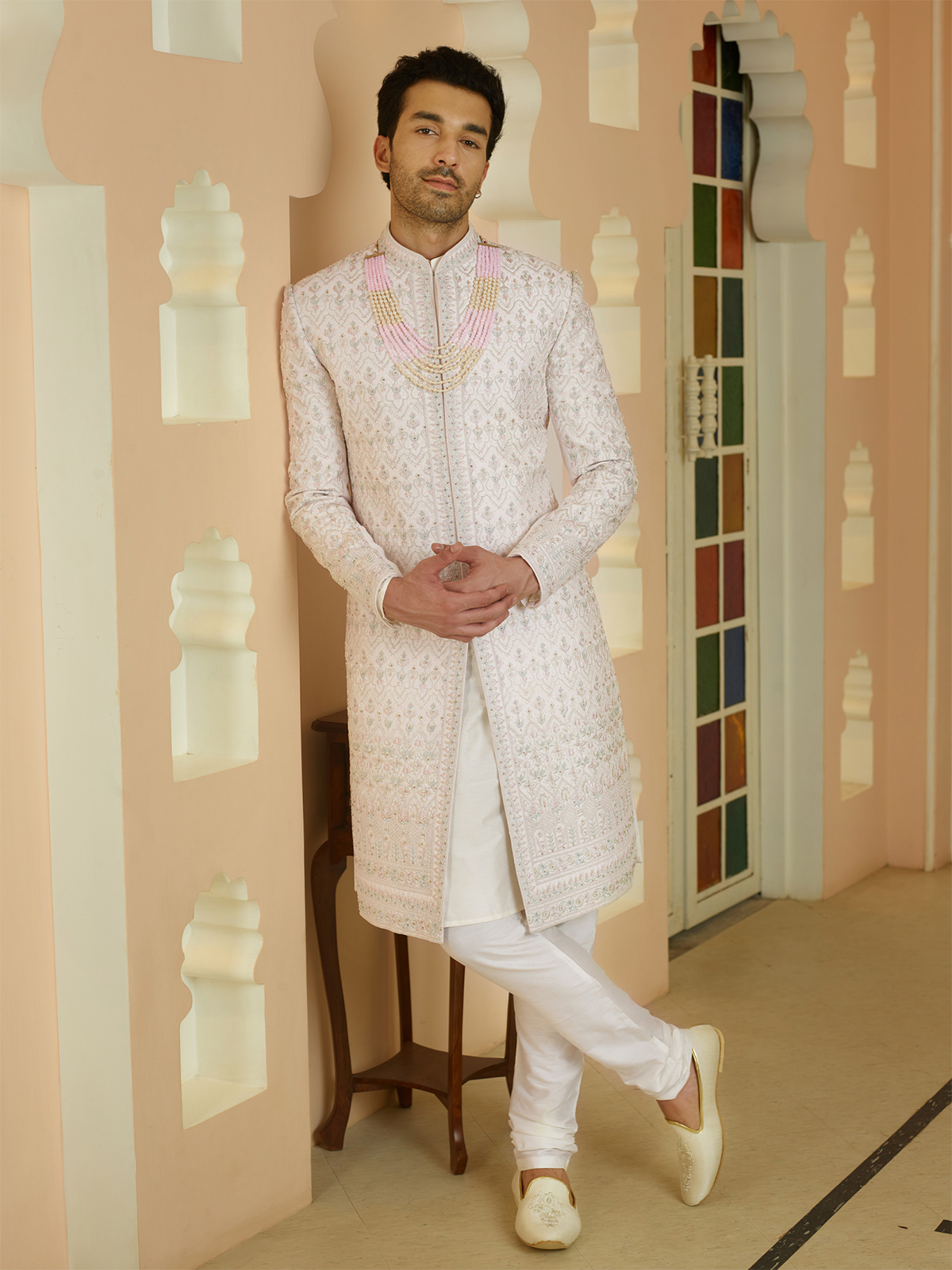 This stunning off white sherwani in silk fabric. A resham, beads, sequins and stone work design works exceptionally well for grooms. Comes with a bottom.