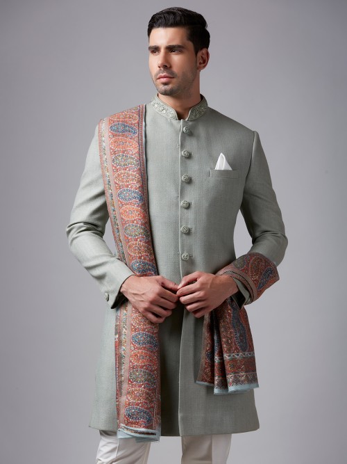 Radiate grace and elegance in our pista green silk plain sherwani, embellished with embroidery work on the collar for a unique charm. Paired with a luxurious pashmina silk dupatta and bottom.