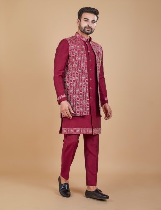 Elevate your charm in this stylish Wine silk Indowestern. This exquisite set features complementing embroidery embellishments. Includes bottom.