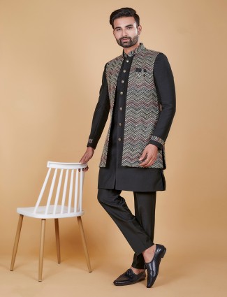 This black silk indowestern is woven with utmost precision and care. The attractive embroidery and sequins work make you look effortlessly elegant. Comes with a bottom.