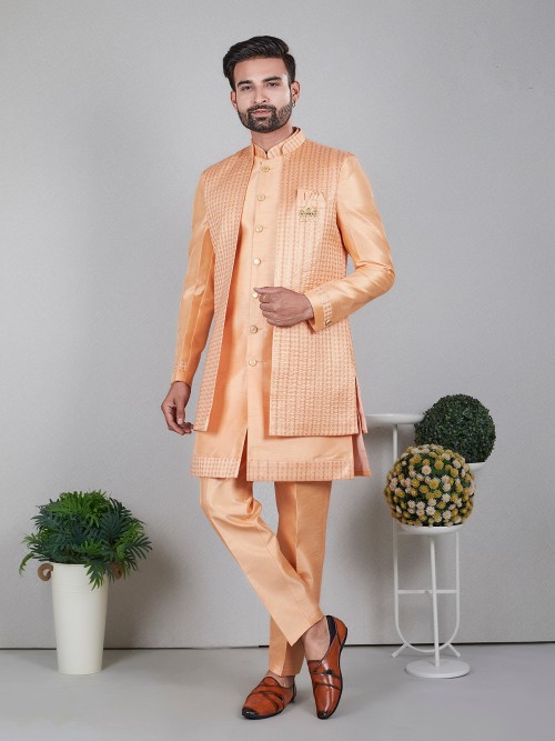 Enhance your beauty and charm in this gorgeous peach raw silk indowestern. Made for every occasion, it features stunning resham and sequins work designs. Comes with a bottom.