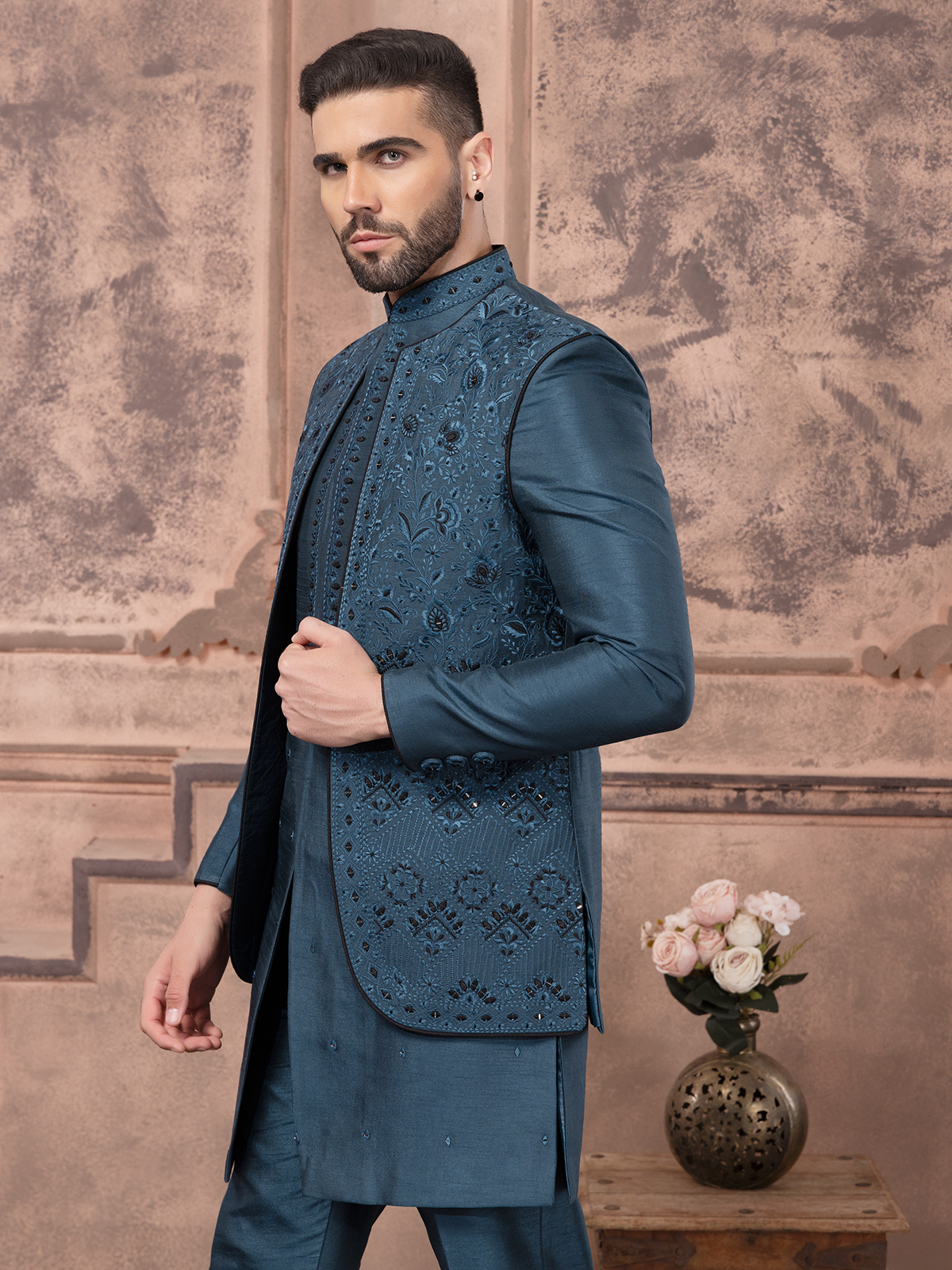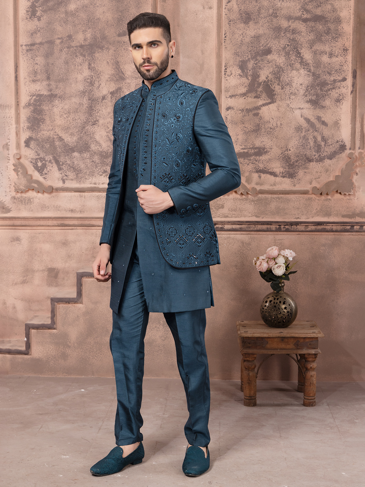 Teal Blue Silk Indowestern For Wedding