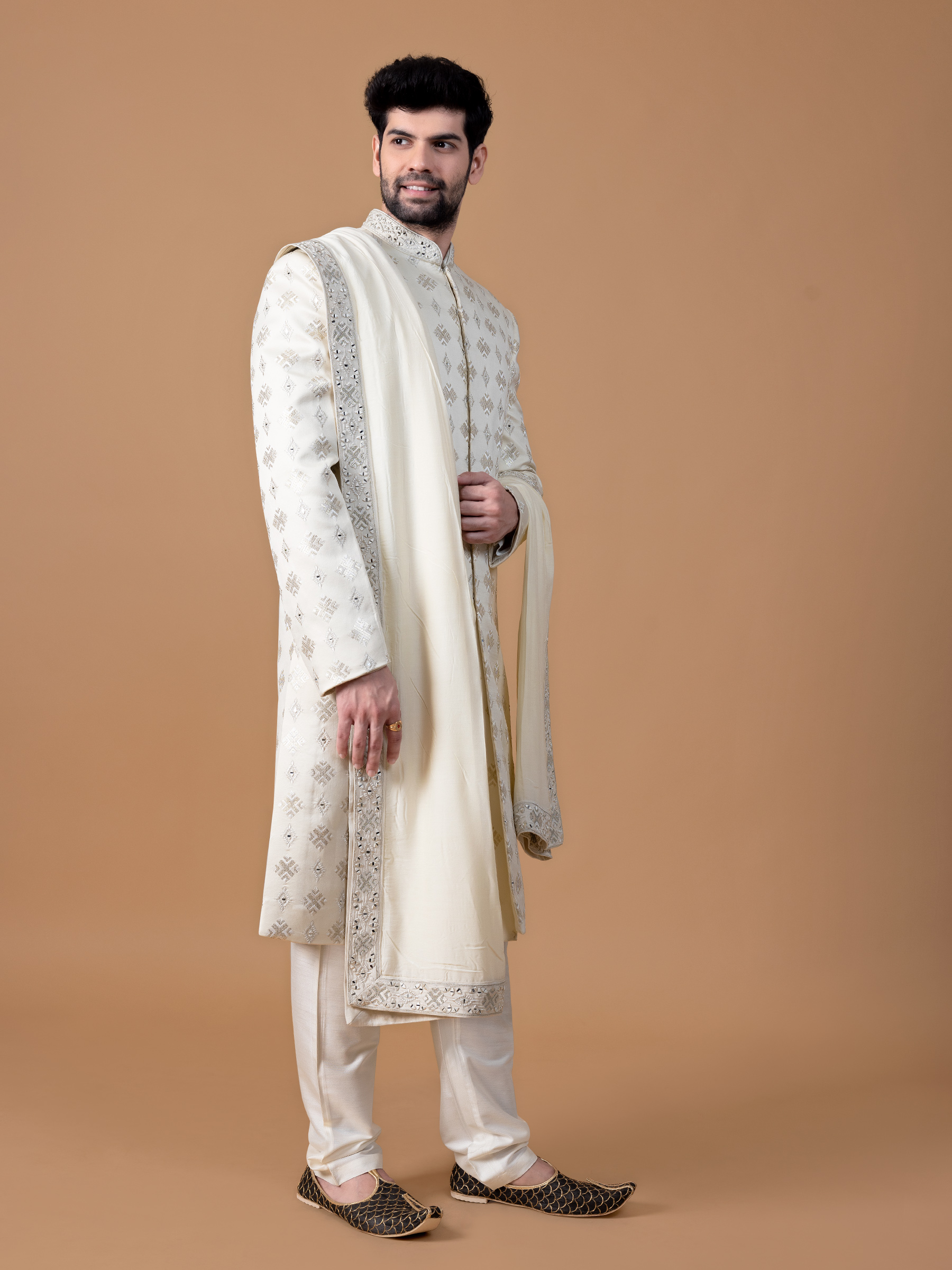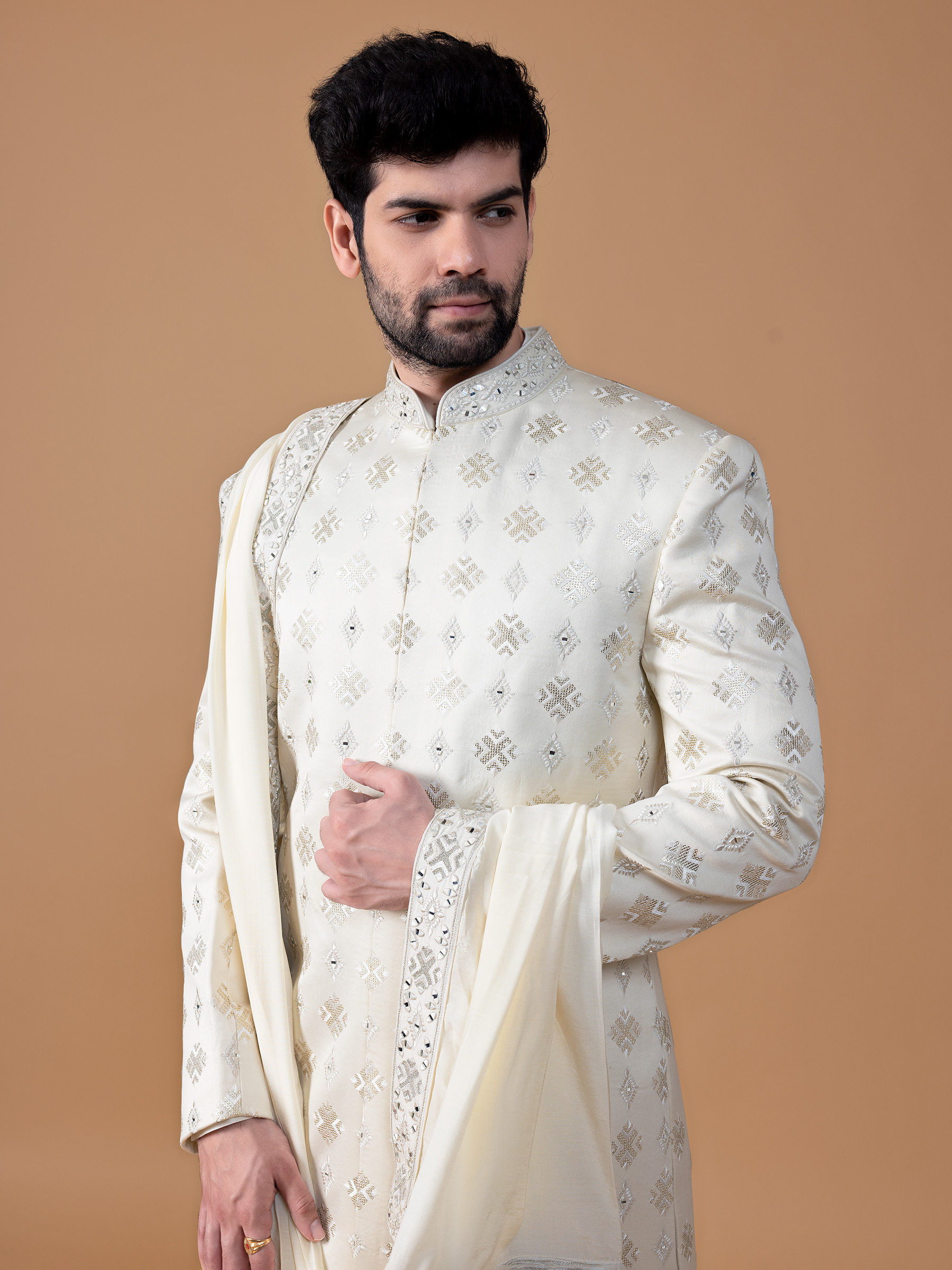Trendy Cream Sherwani In Silk