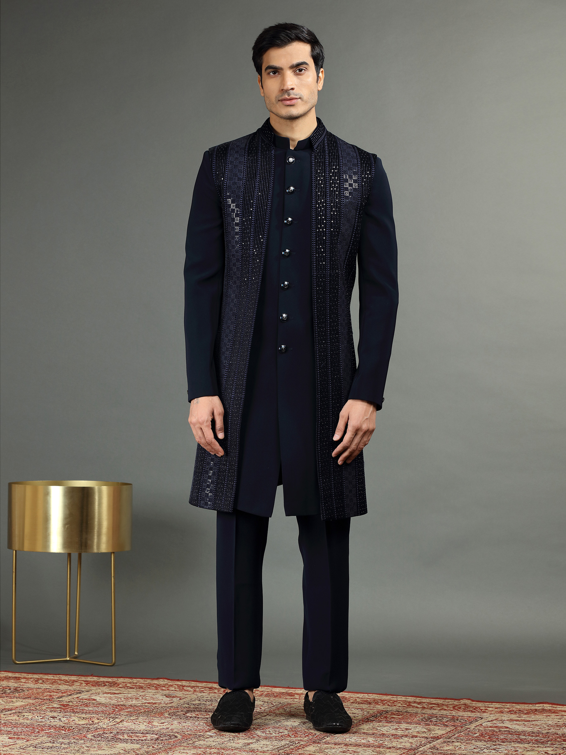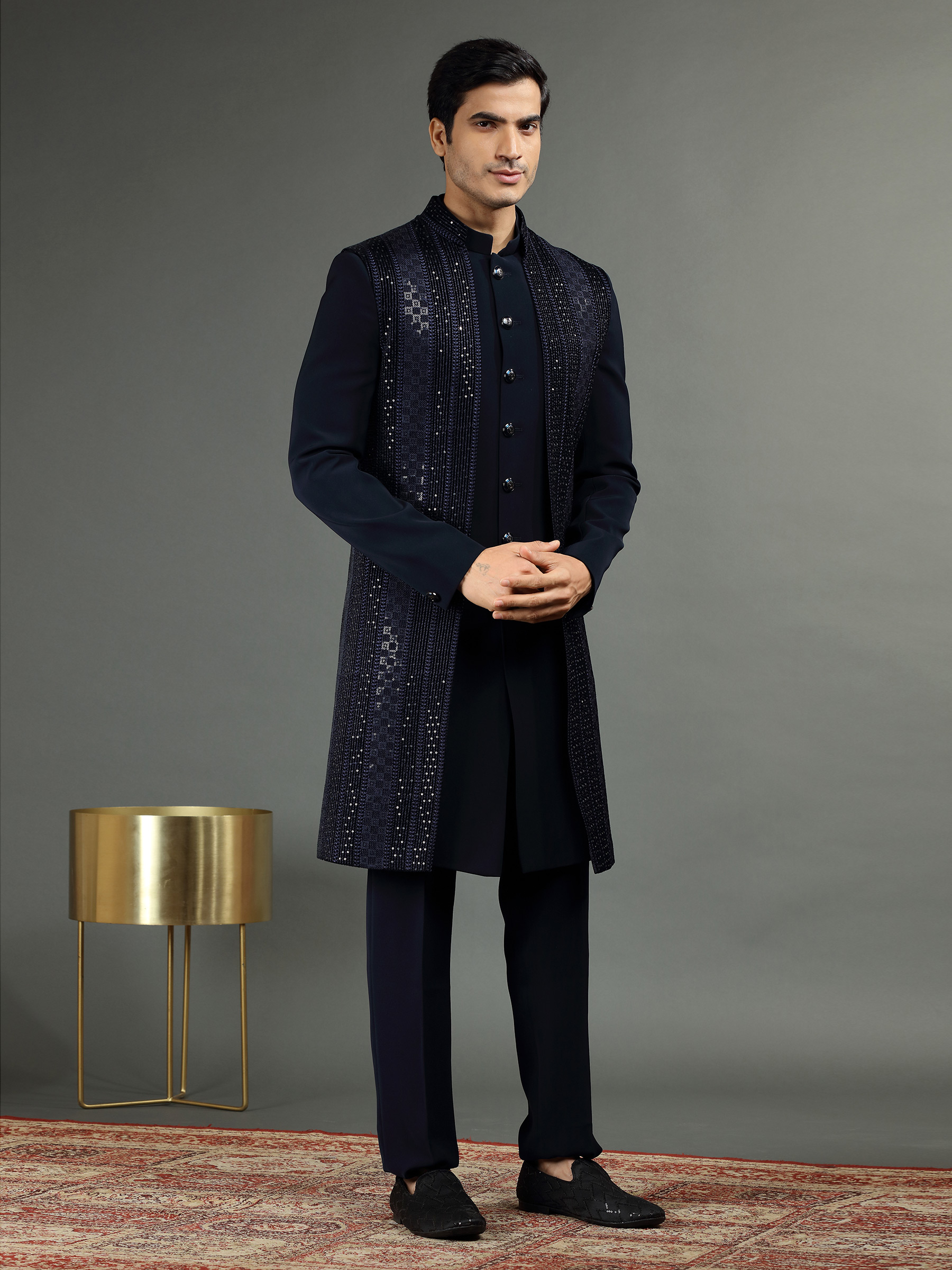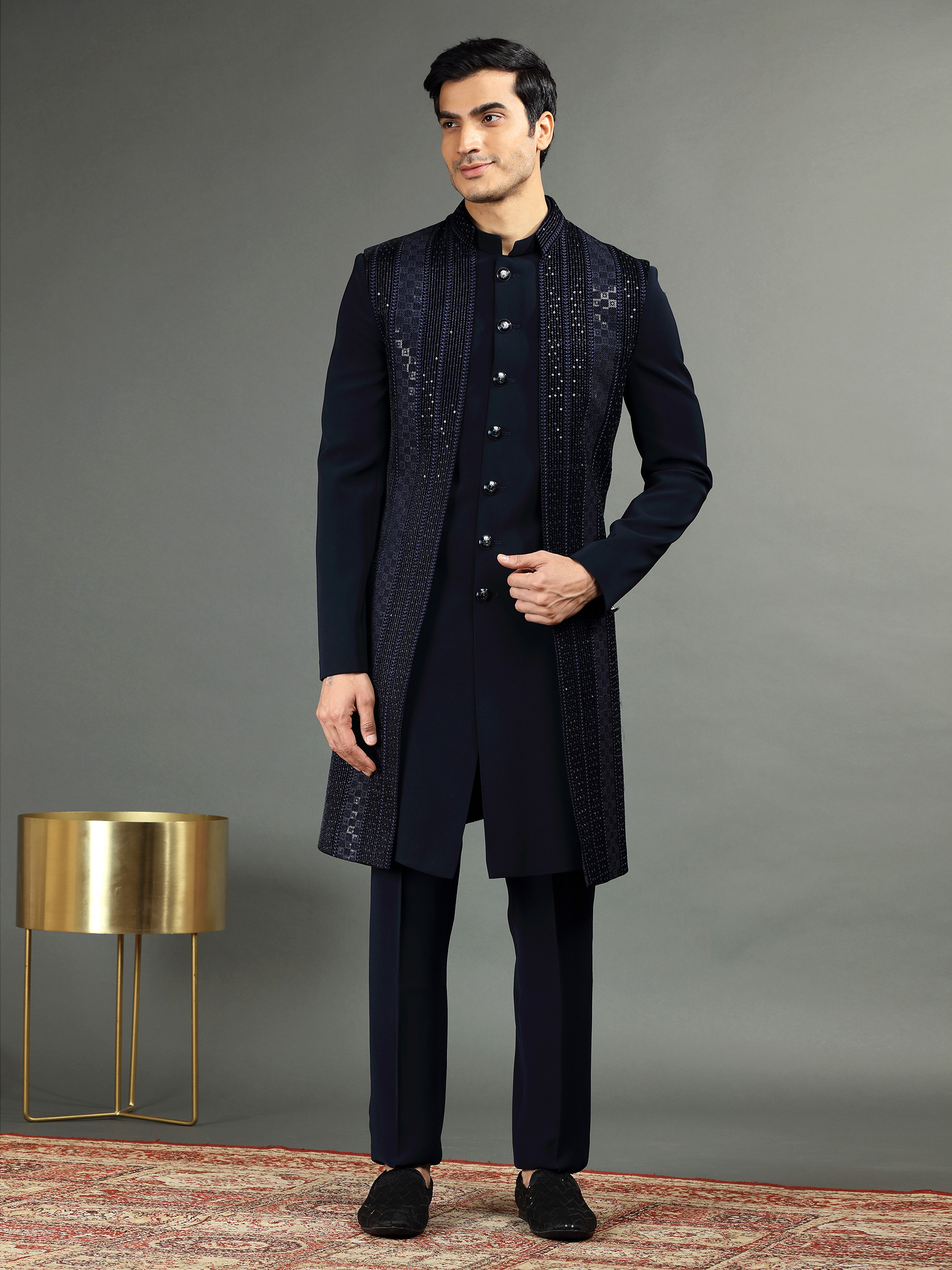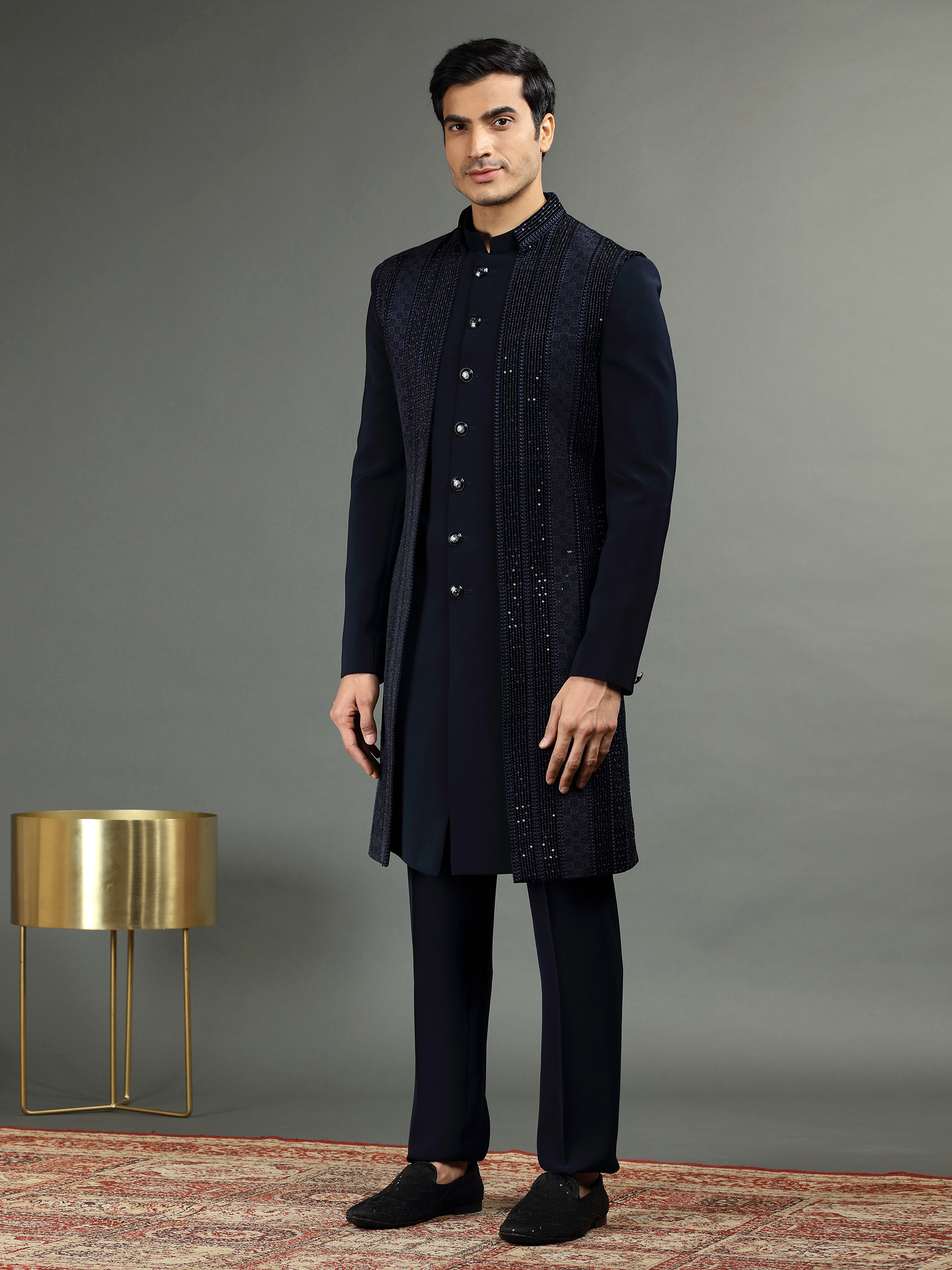 Experience the perfect blend of style and sustainability with our velvet and terry rayon Indowestern in striking navy. Its captivating embroidery, resham and sequin work make it an exceptional choice. Comes with an unstitched bottom.