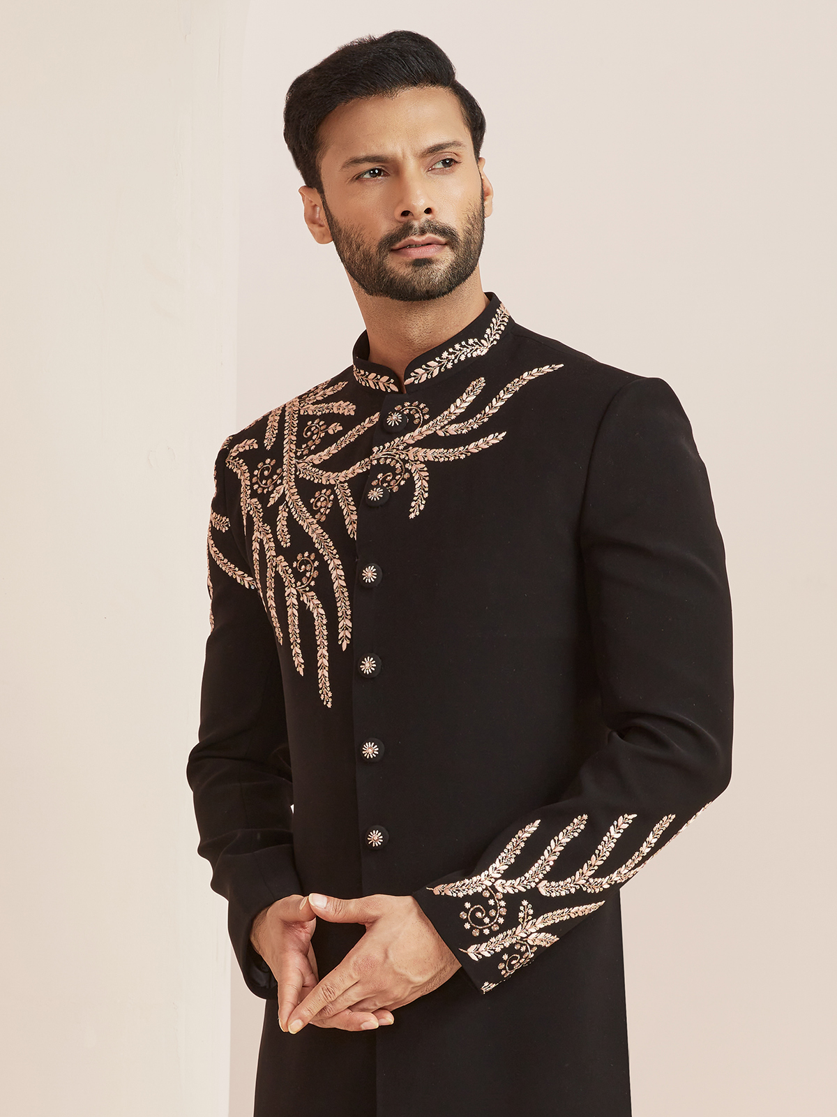 Elevate your wedding attire with this charming black suede indowestern. This piece is tailored with suede material and adorned with embroidery and zari work, perfect for adding a touch of elegance to your look. It also features a stand collar neck, full buttoned placket, and full sleeves. Moreover, it includes an unstitched bottom garment.