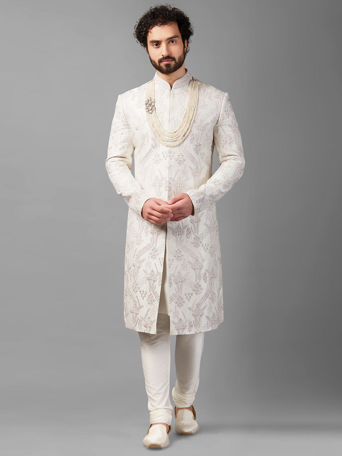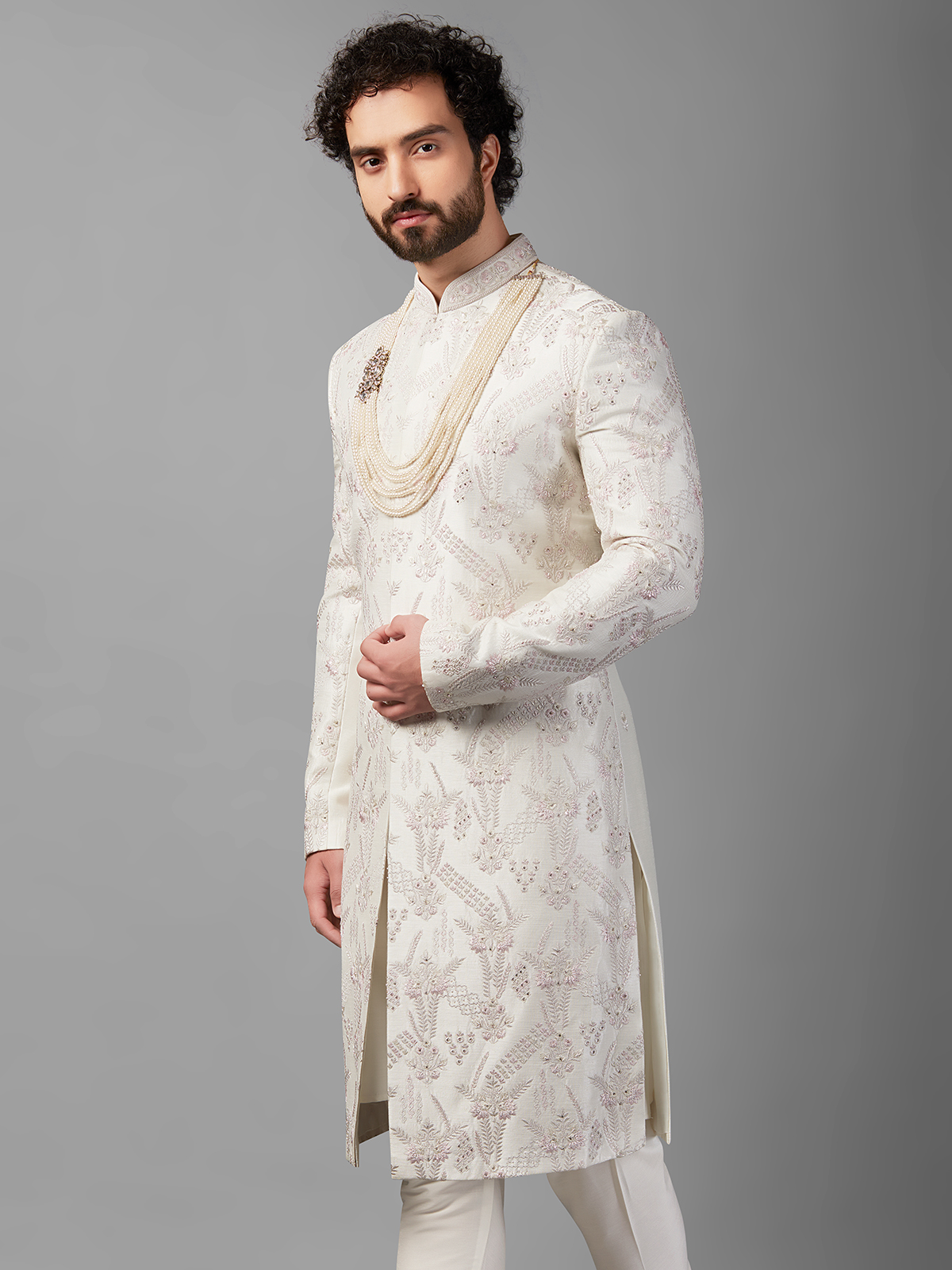 Who said that white wasn't appropriate for a wedding, Take a peek at this exquisite white sherwani made of raw silk. Because of the beadwork, stone, sequins, and resham embroidery, this piece is ideal for a wedding. A churidar goes well with the sherwani.