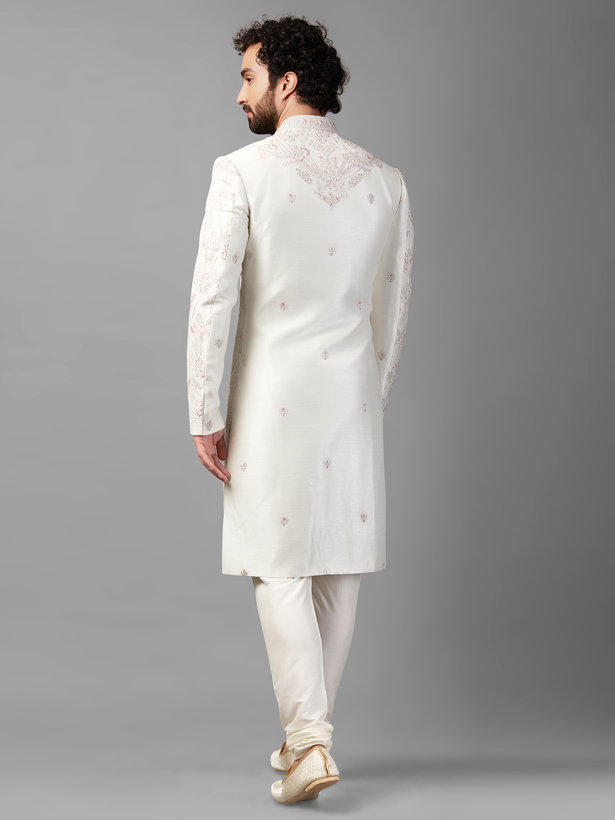 White Raw Silk Embroidery Sherwani For Wedding