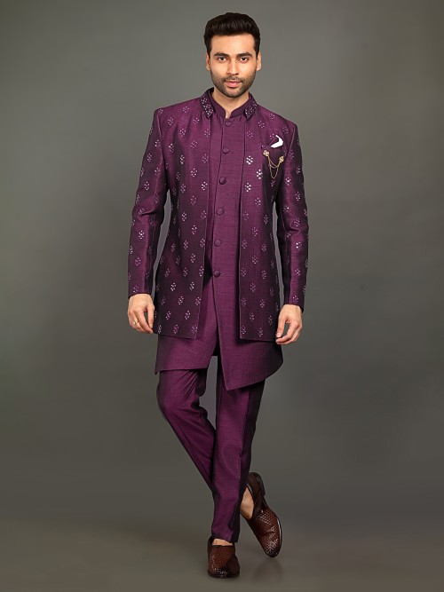 Wine Cotton Silk Indowestern For Men