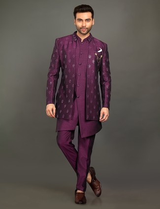 Incredible style in this Indowestern cotton silk wedding and party attire. Decked all over with embroidered work, mirror, and resham. Features include a vented hemline, welt pocket with pocket tie, long sleeves, a stand collar, and a full button placket. Pants are included.