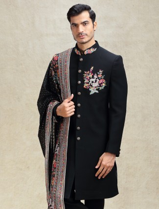 Our timeless masterpiece, this luxurious black Terry Rayon sherwani set exudes refined elegance. Elevated with exquisite hand-thread embroidery, the sherwani is adorned with delicate resham, zardosi, shimmering sequins, stones, and cutdana work. Expertly crafted with full sleeves and a front button placket, this regal ensemble is completed with pants and a richly embellished dupatta, featuring the same intricate detailing for a stunning, cohesive look.
