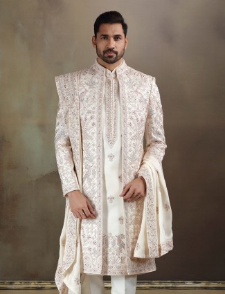 Cream Crochet Long Jacket Sherwani With Dupatta And Pant