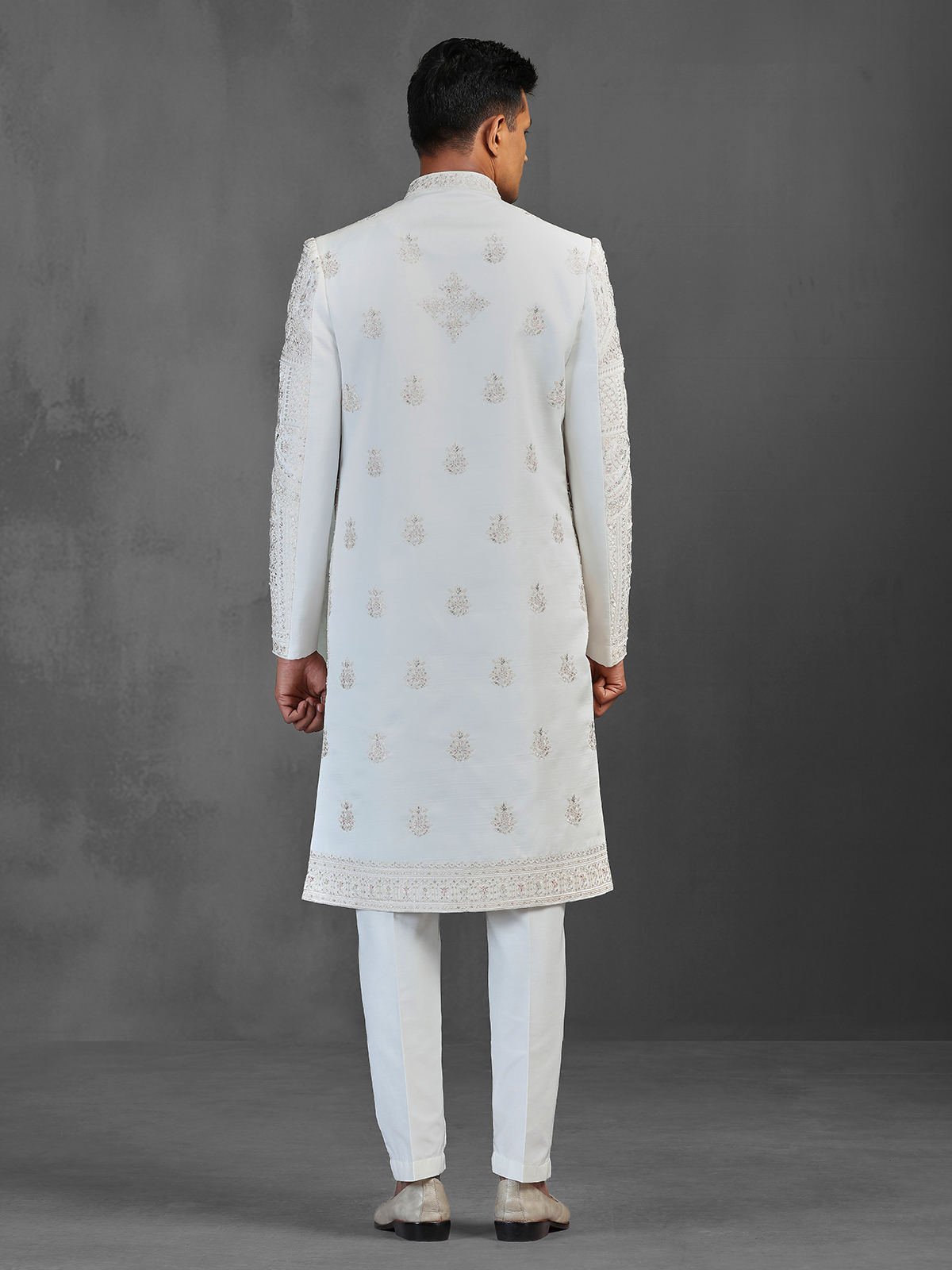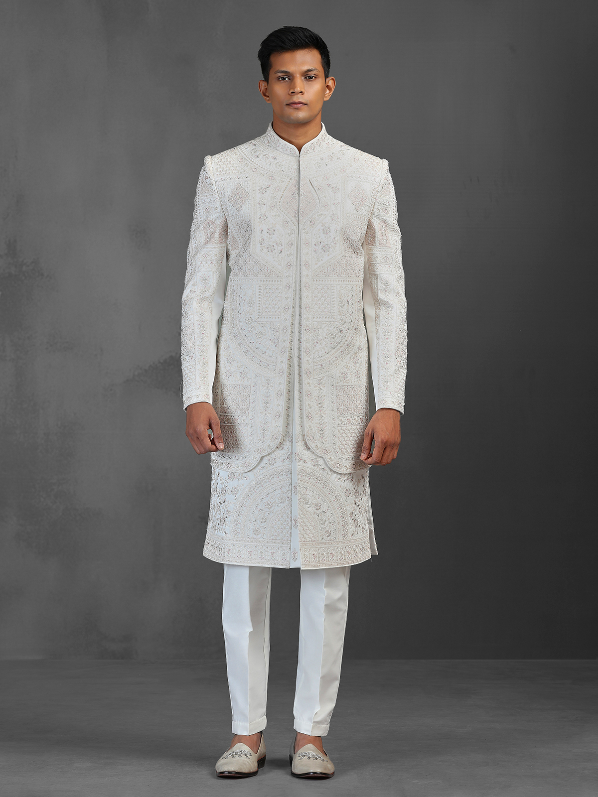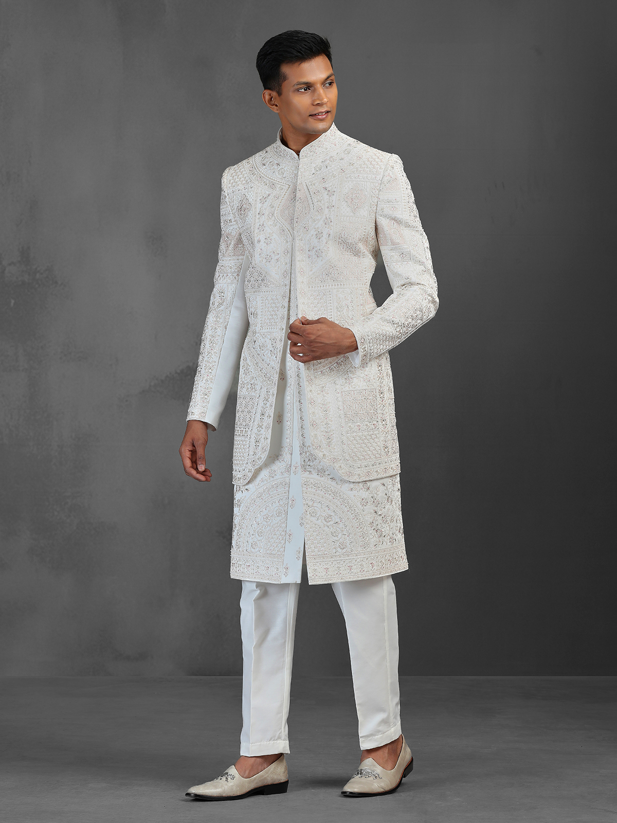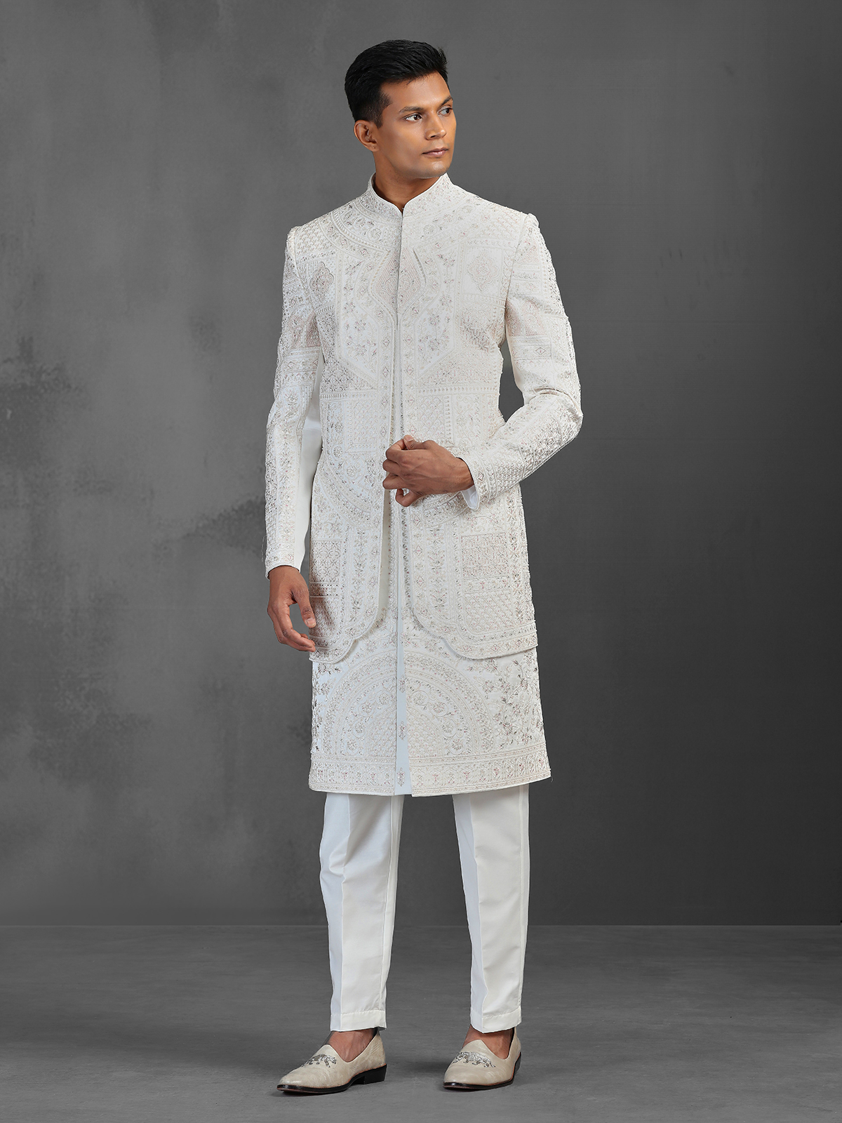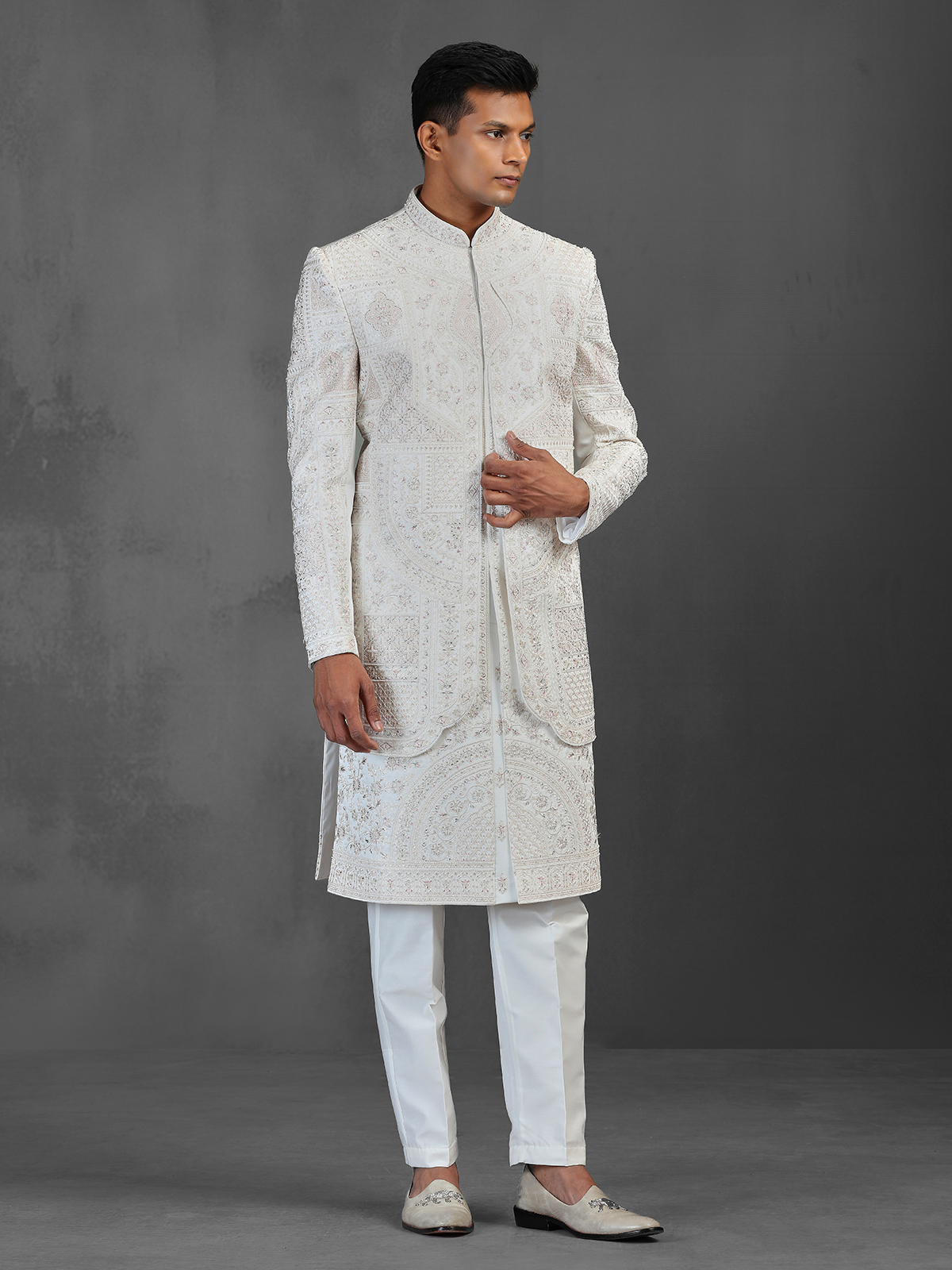 Cream Silk Designer Sherwani With Rich Embellishments For Wedding