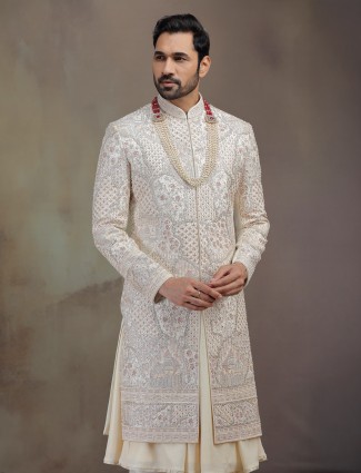 Cream Silk Peshwai Sherwani For Groom