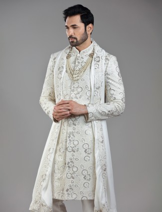 Rich cutwork, sequins, and embroidery embellishments enhance this cream sherwani made of opulent silk fabric. While the matching bottom and dupatta guarantee the groom's comfort on his special day, the stitching adds a royal touch.