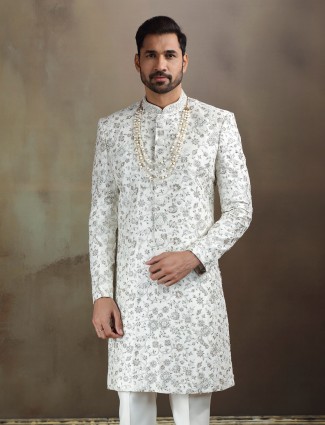 Rich cream tava silk showcases resham, cutdana, threadwork, sequins, and diamond embellishments. Teamed with tailored pants, it delivers a dignified, enduring wedding look for the modern groom.