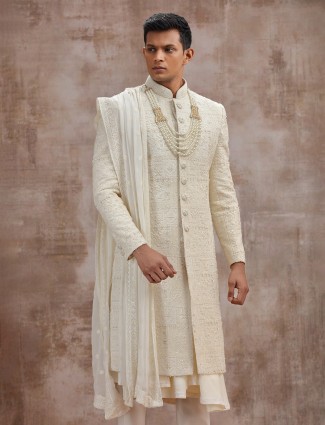 In a rich gold hue, this peshwai-style art silk sherwani boasts embroidery with sequins, cutdana, zardosi, and beads. Paired with pants and a dupatta, it delivers royal sophistication for a groom’s regal wedding ensemble.