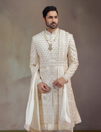 Glowing in light gold silk, this Peshwa sherwani is crafted for royal celebrations. Embellished with cutdana, sequins, embroidery, and Swarovski highlights, it gleams with sophistication. Paired with a traditional chudidar and dupatta, it balances elegance with tradition. Made for weddings, this ensemble makes the groom’s day radiant, adding a majestic aura of timeless grace and refined grandeur.