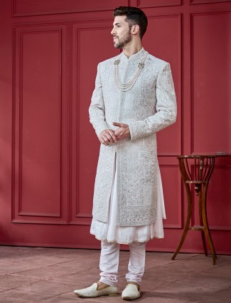 Crafted in powder pastel pink silk, this sherwani showcases geometric and traditional motifs with intricate kasab, zari, and poth work ideal for the groom with a refined taste.