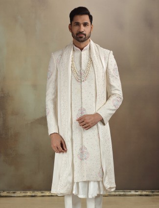 Cream banarasi silk in peshwai style glistens with embroidery, cutdana, thread, sequins, stones, and pearls. Finished with pants and a dupatta, it offers unparalleled grandeur for the groom’s big day.