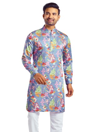 Blue silk kurta designed with attractive print. The full sleeves and mandarin collar provide a classic and timeless look.