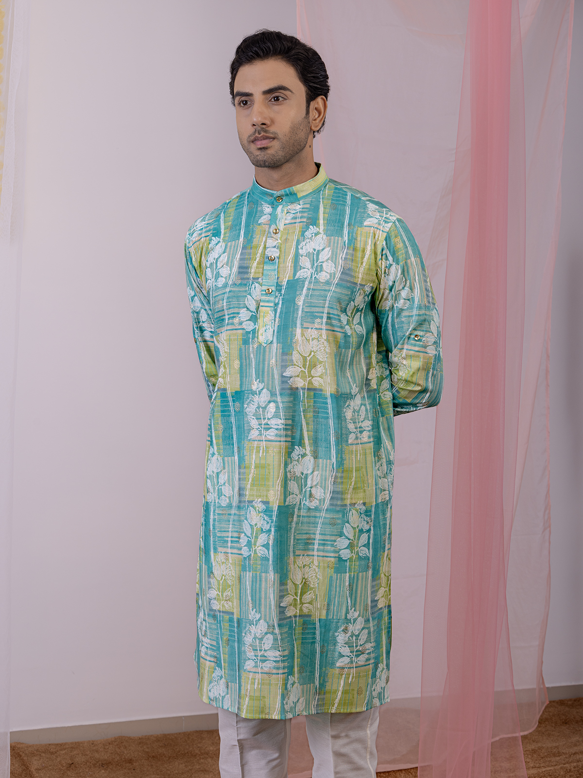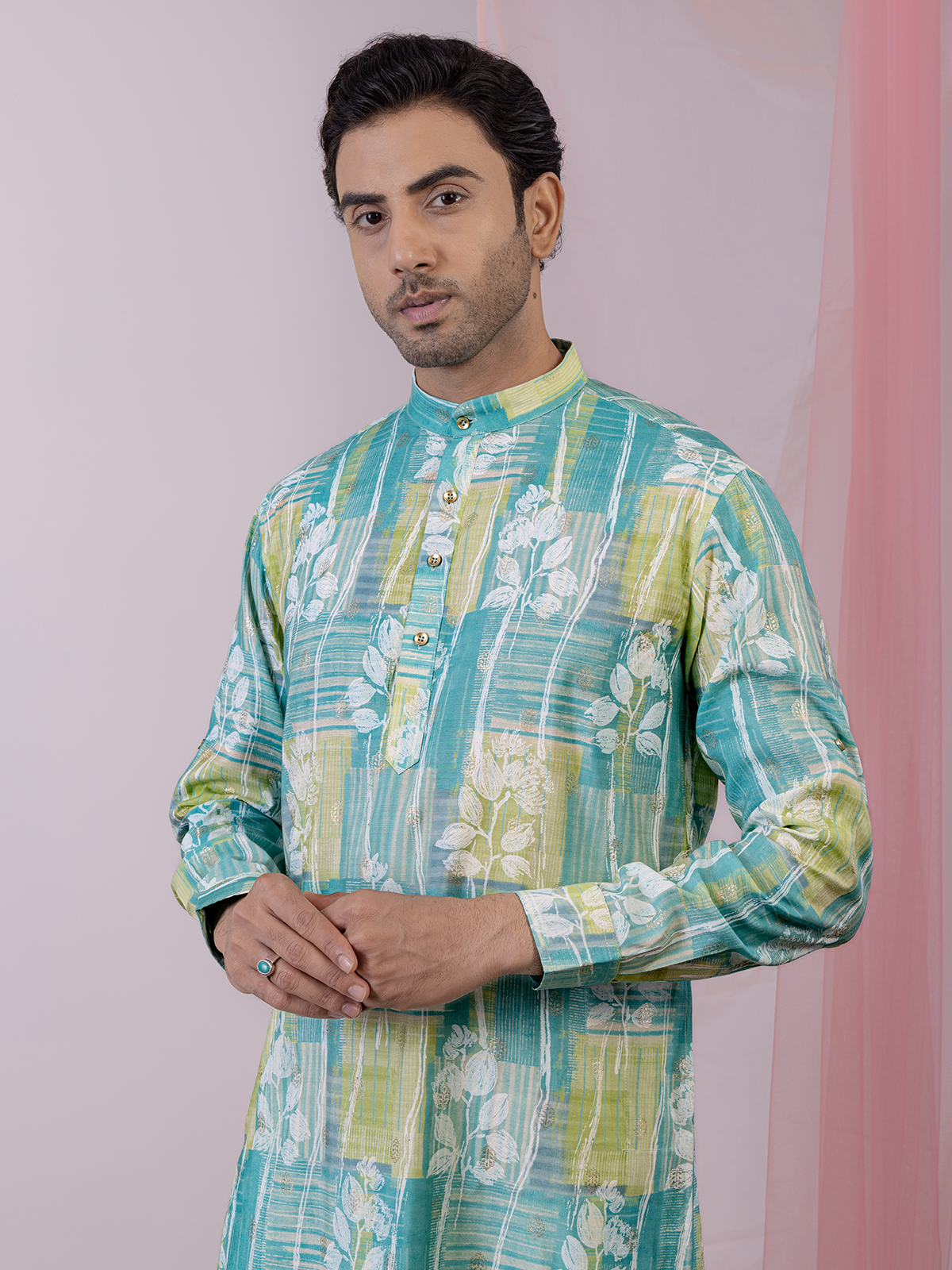 Bring elegance to your festive celebrations or family events with this aqua silk kurta. Enhanced with unique print pattern and little touch of zari, full sleeves, and a mandarin collar, it carries a graceful aura while keeping your style refined and timeless.