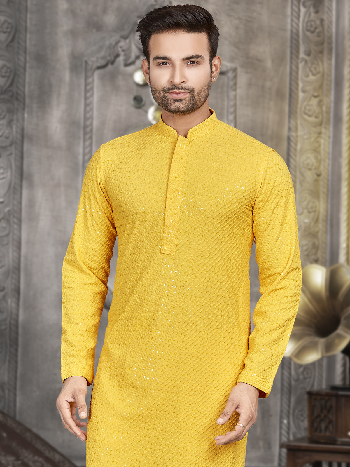 Made for the stylish men out there, this yellow cotton embroidery kurta is sure to steal the spotlight. It has a mandarin collar and full sleeves to look smart.