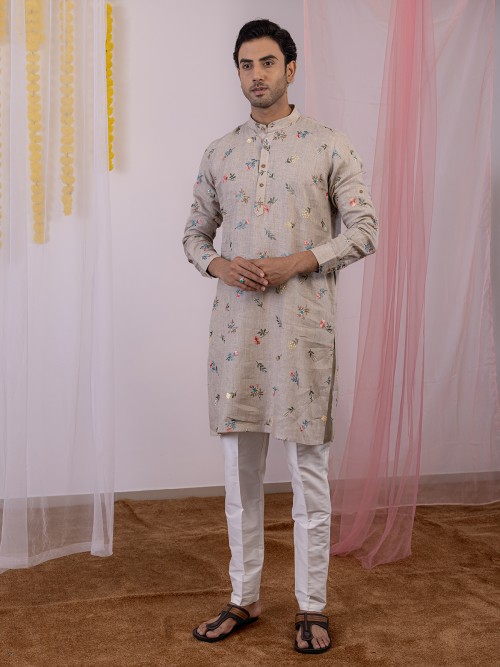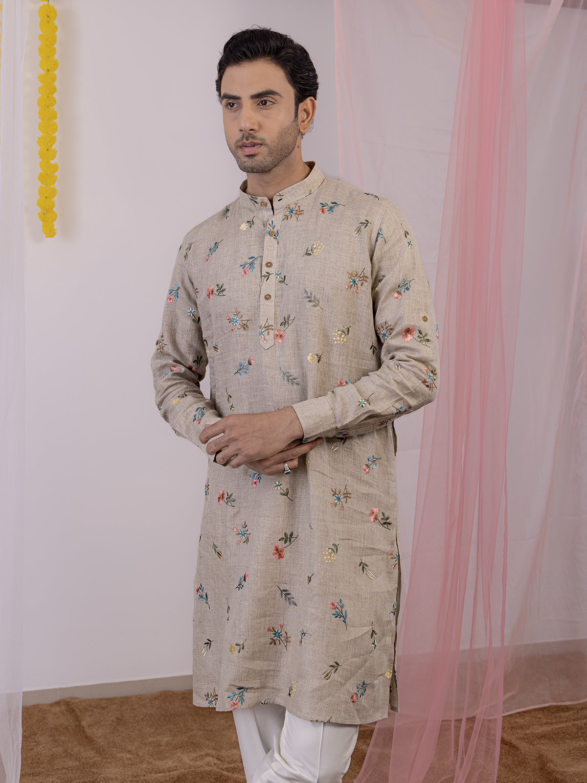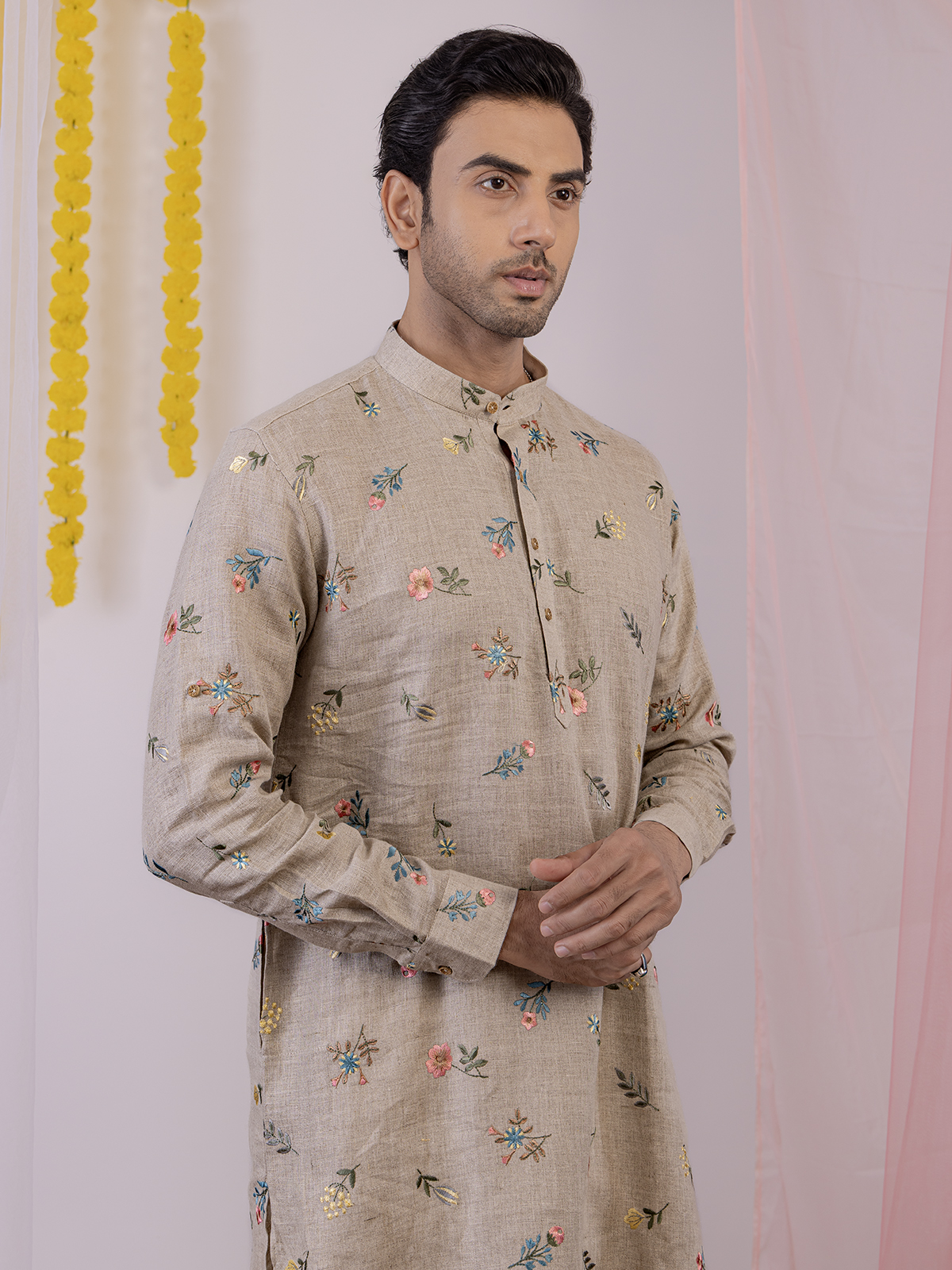 Flaunt effortless charm at festive occasions or family gatherings with this beige linen kurta. Designed with refined embroidery, a smart mandarin collar, and full sleeves, it blends traditional grace with subtle sophistication for a rich and appealing look.