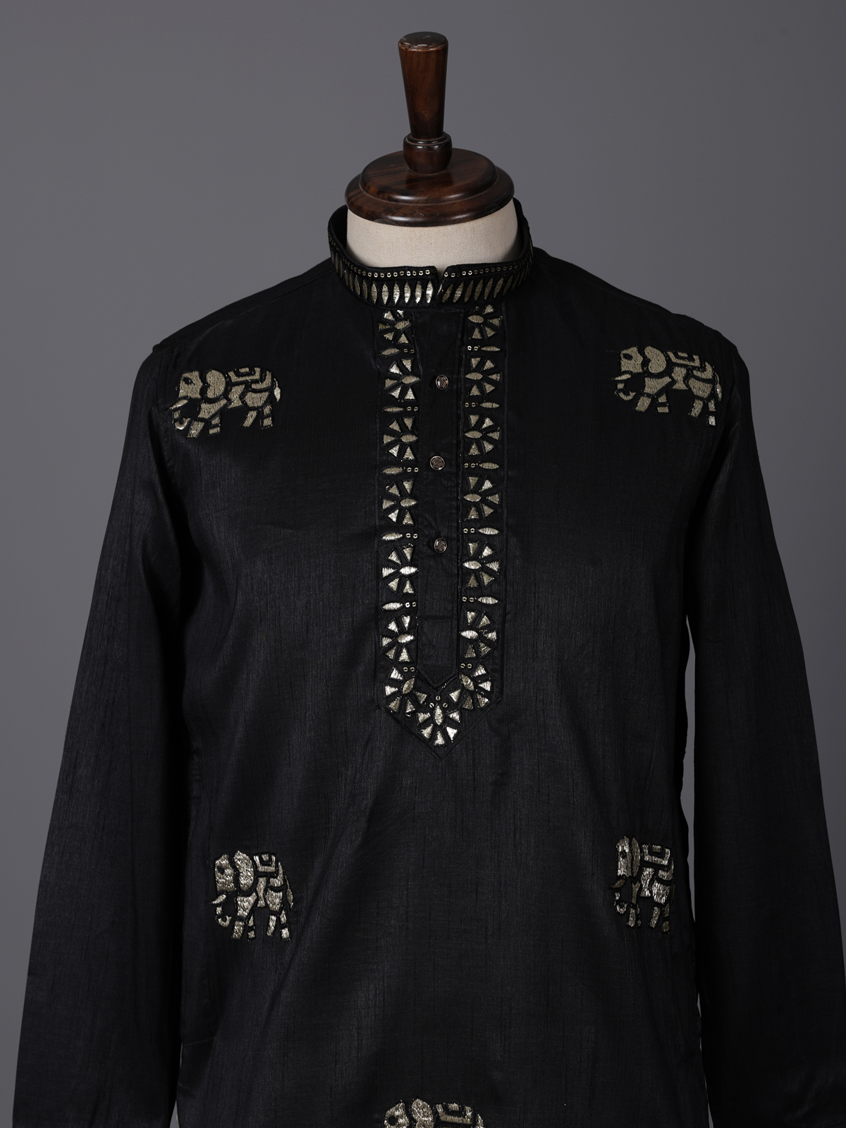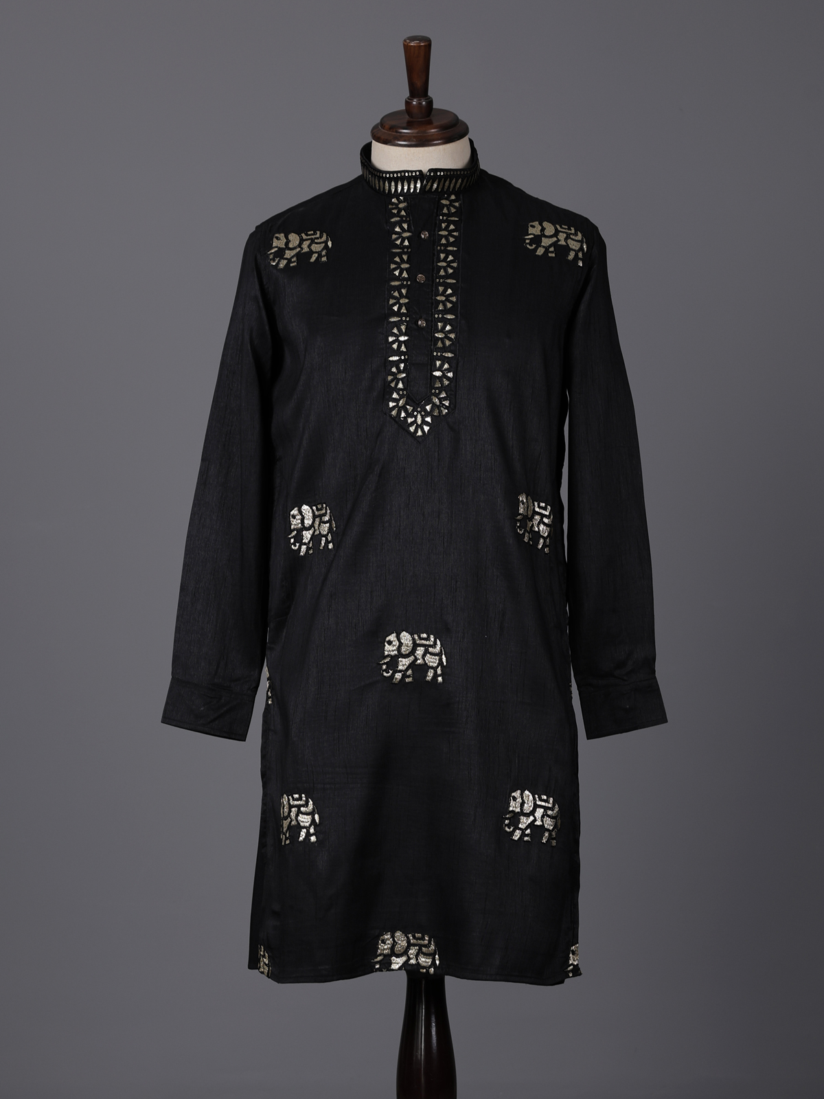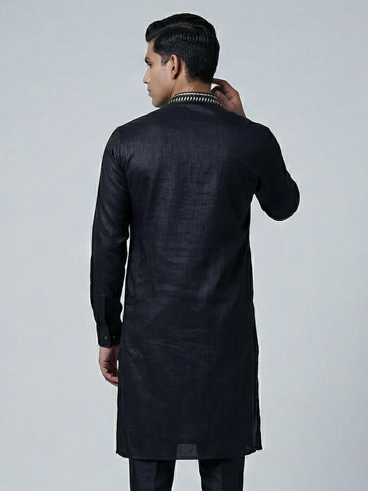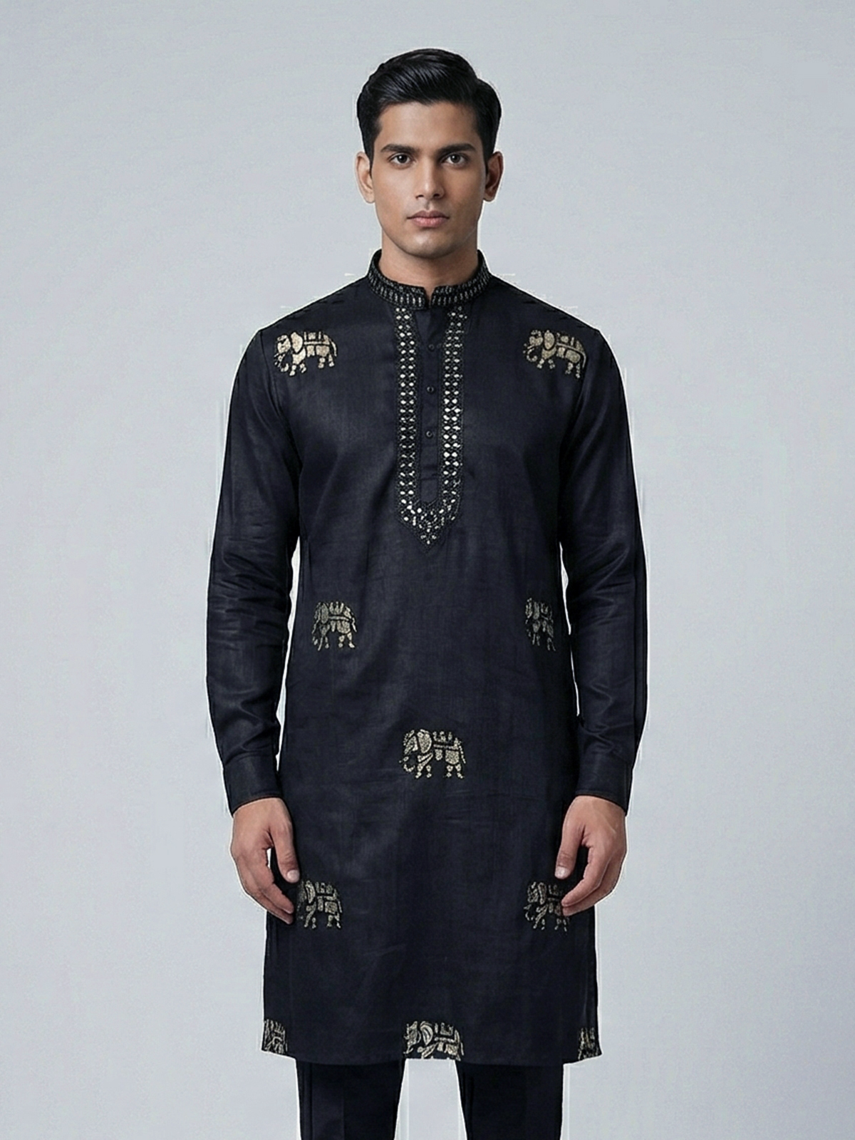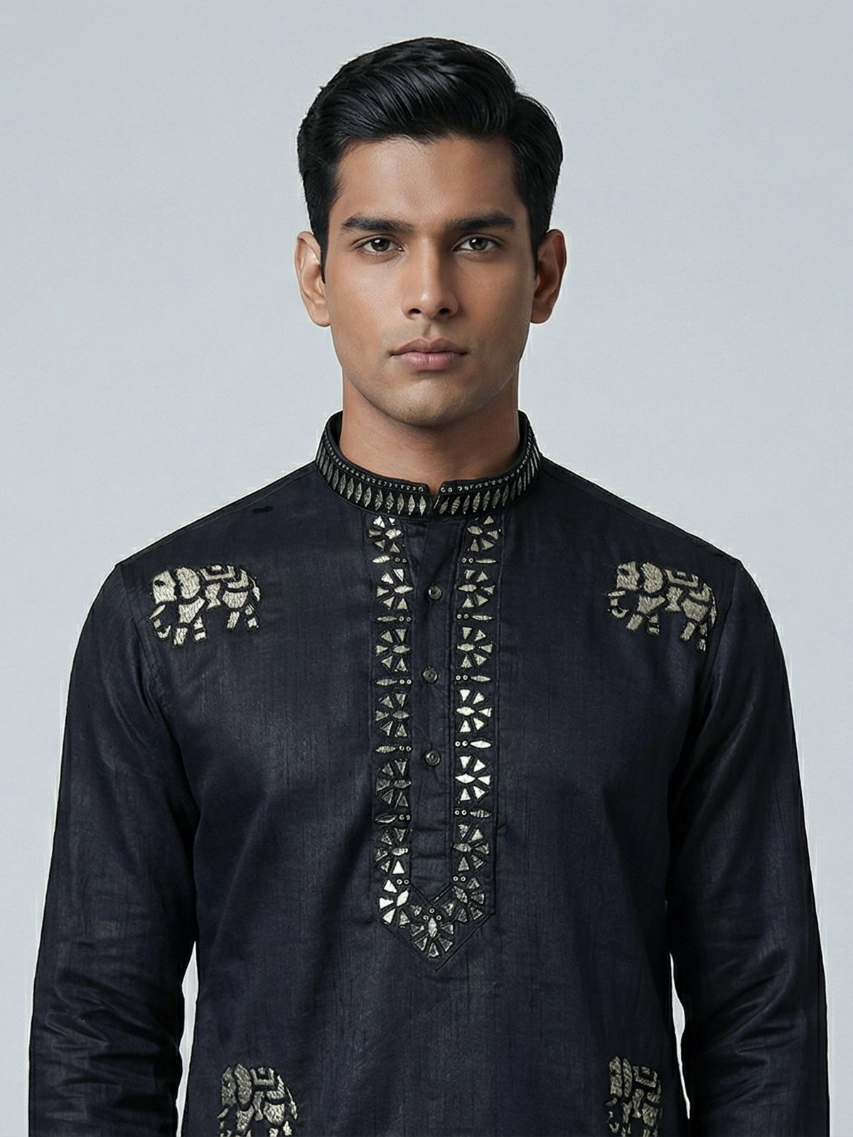 Bold black tones bring striking elegance to this silk kurta crafted for grand celebrations. Enhanced with intricate embroidery and sequin detailing. It reflects luxurious festive charm. The chinese collar sharpens its silhouette. While the rich fabric adds a regal touch. Ideal for weddings and festive evenings. This kurta creates a powerful and sophisticated ethnic look.