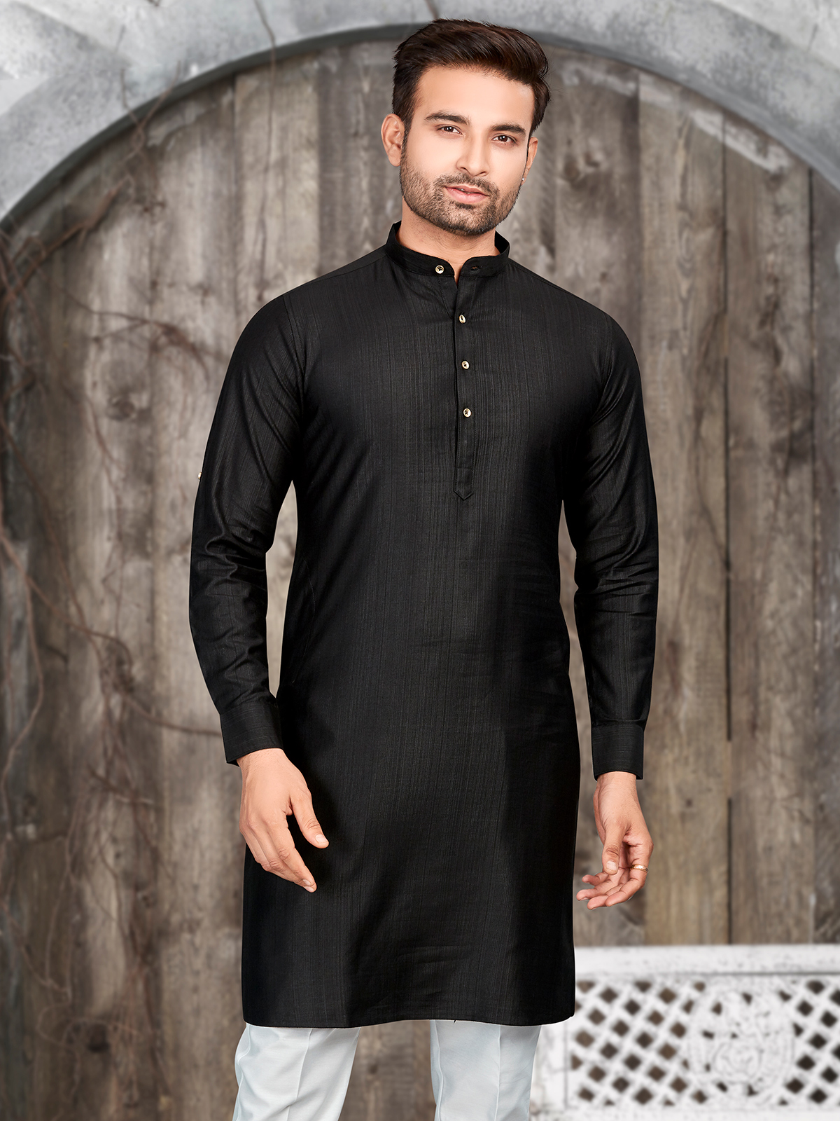 Embrace effortless style with this black silk plain kurta. The mandarin collar and stylish full sleeve make it a versatile addition.