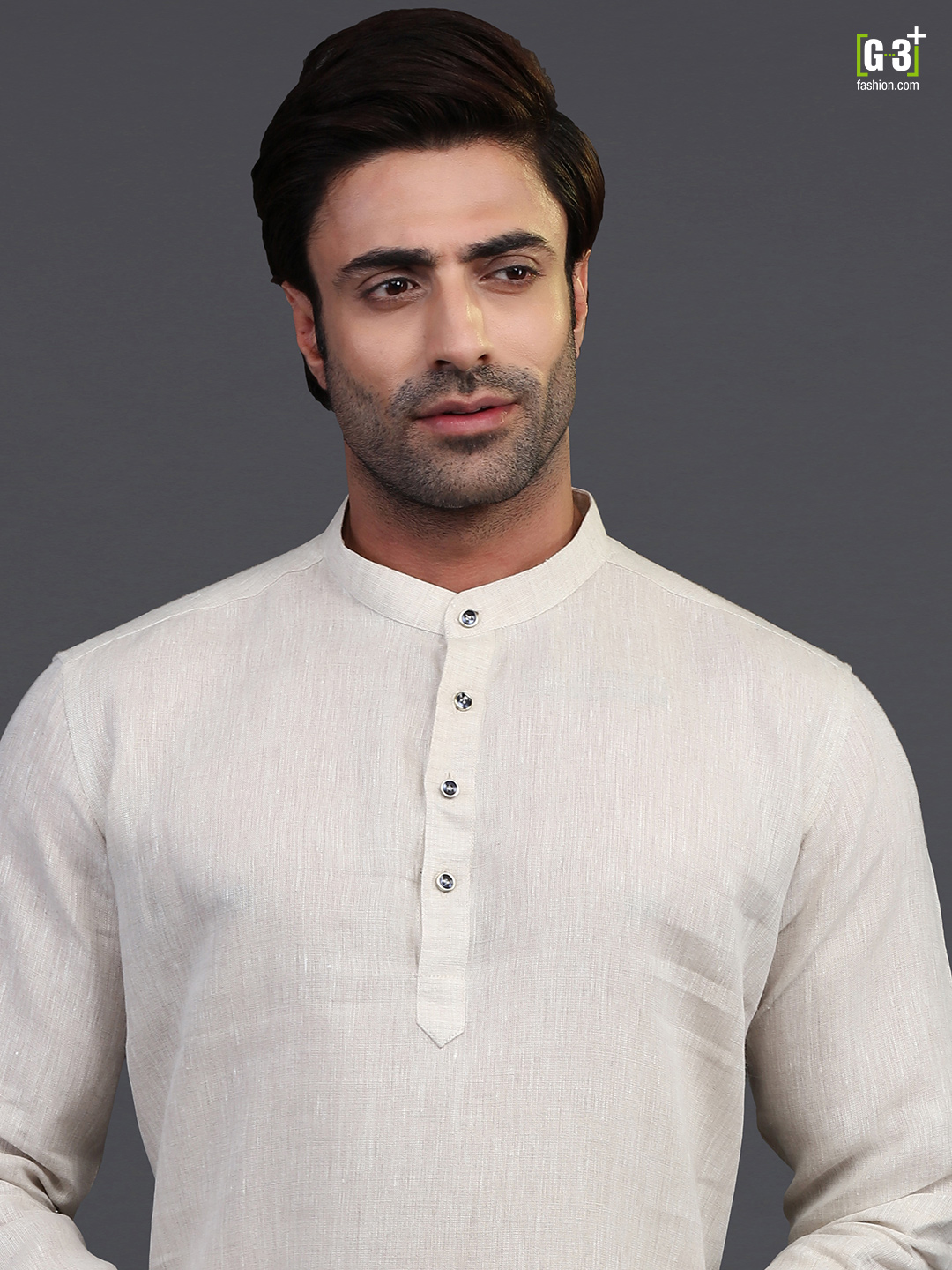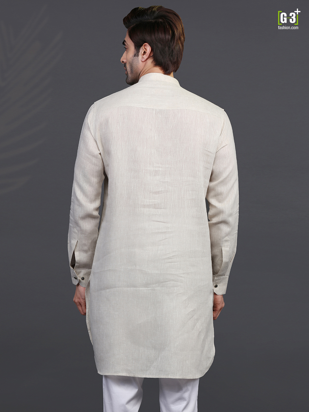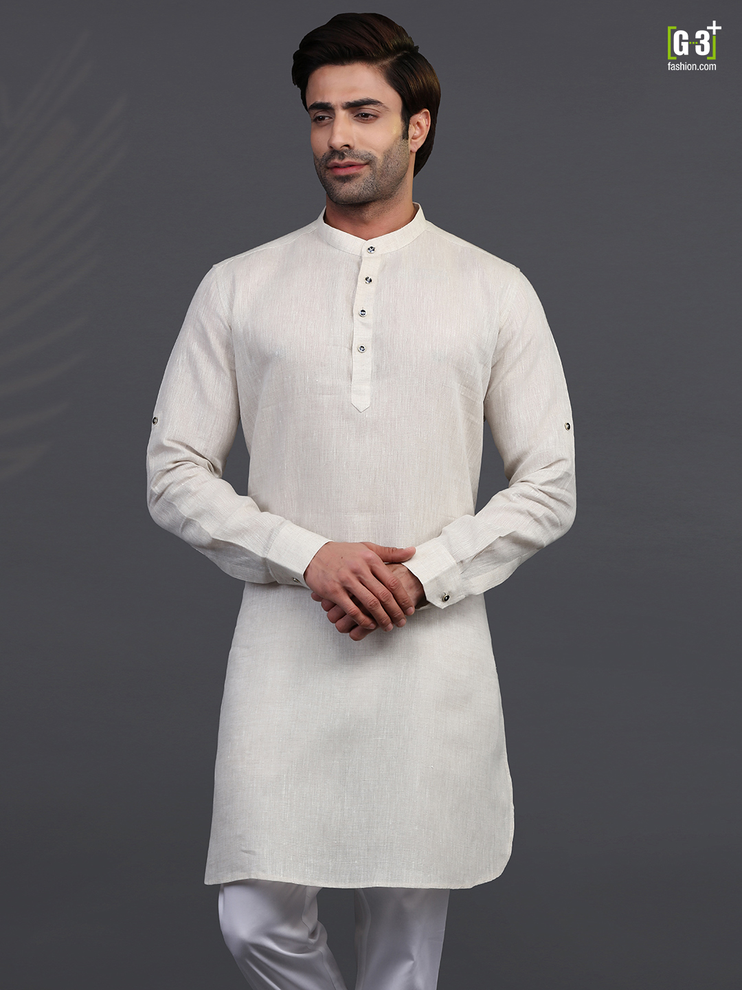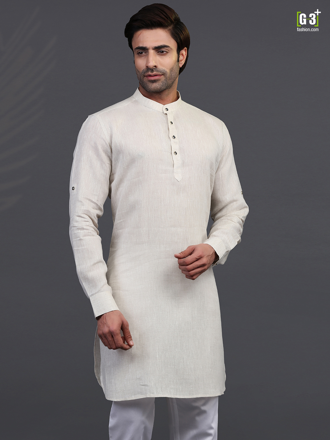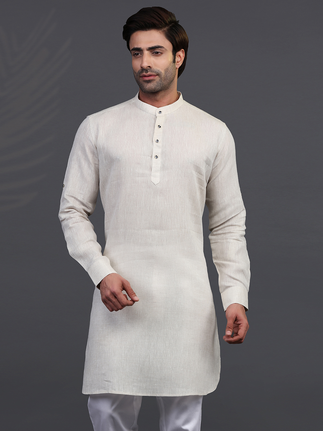 Look your best with this cream linen kurta for festive occasions. The Chinese collar, short button placket, full sleeves and vented hem make it a great choice.