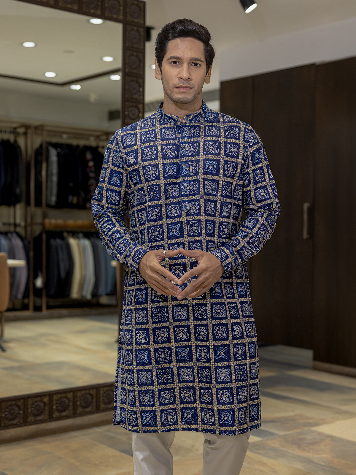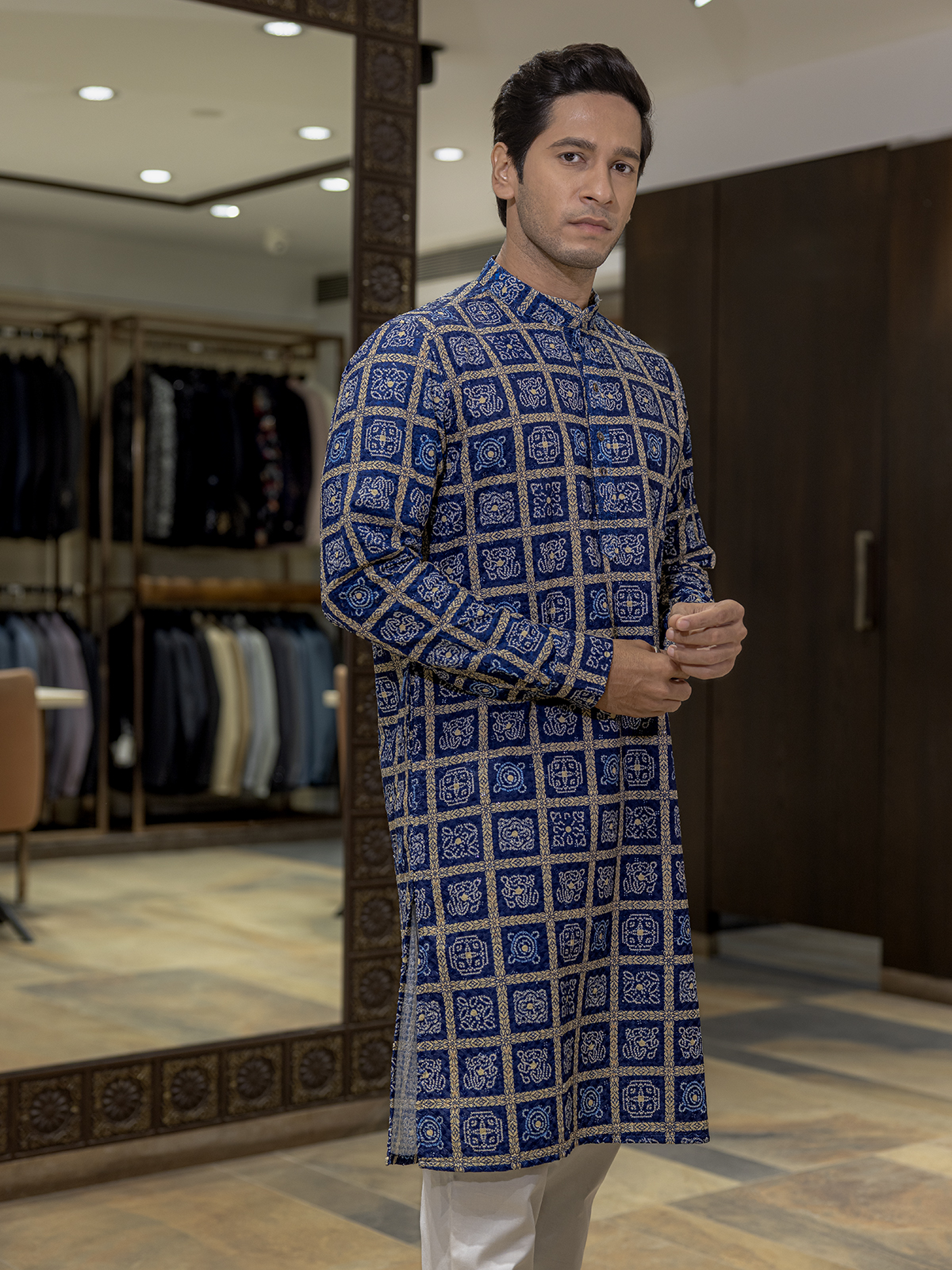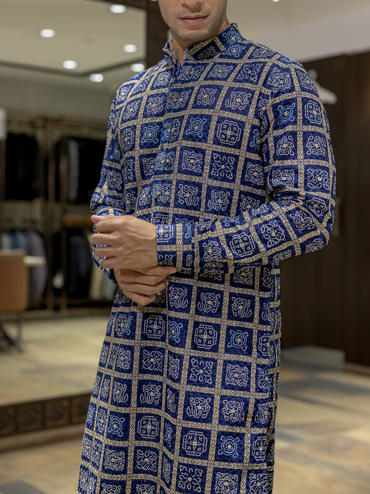 Majesty in blue, this bandhej silk kurta showcases printed artistry. Designed with a mandarin collar and full sleeves, it embodies traditional richness with modern finesse, making it an impeccable pick for festive gatherings and cultural events.