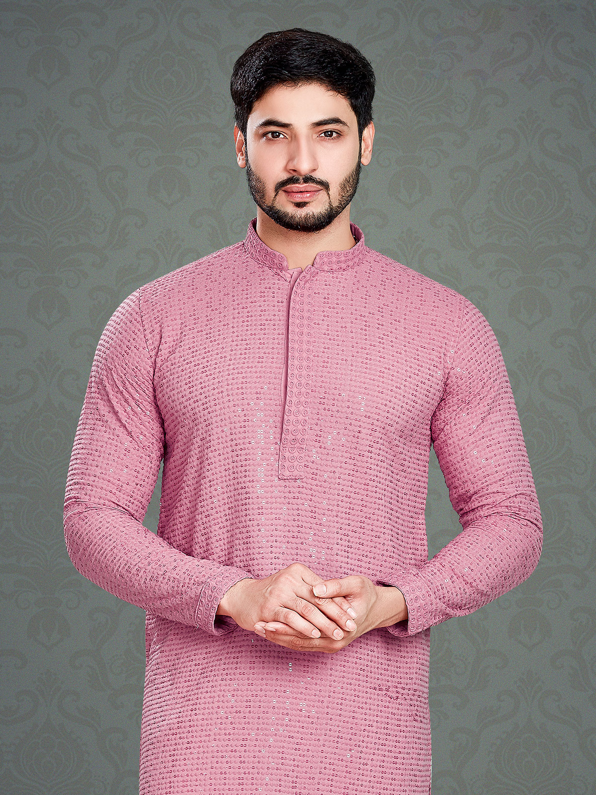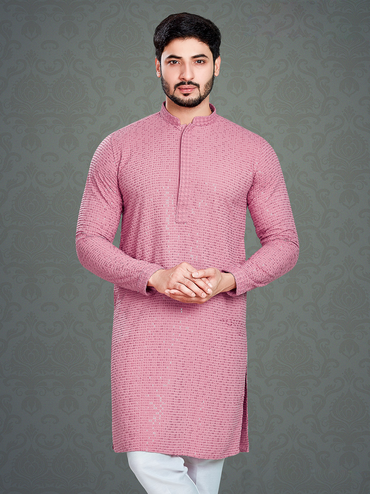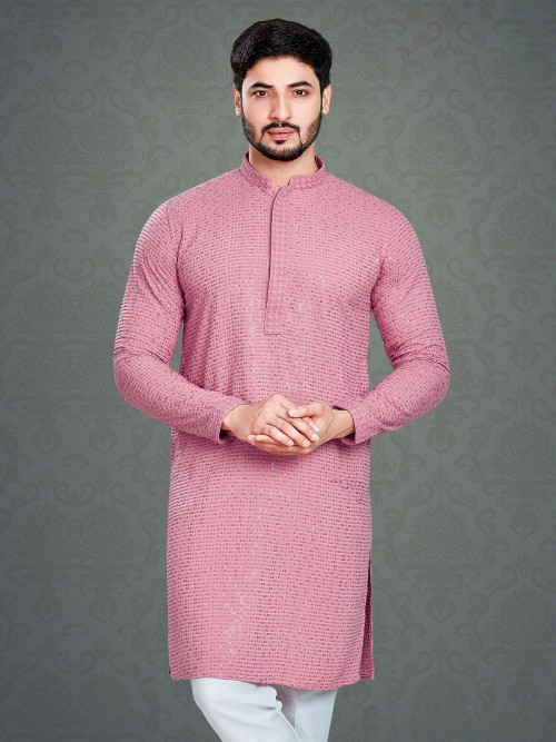 This classy pink cotton kurta with embroidery, resham and sequins work. The mandarin collar and full sleeves offer a versatile look.