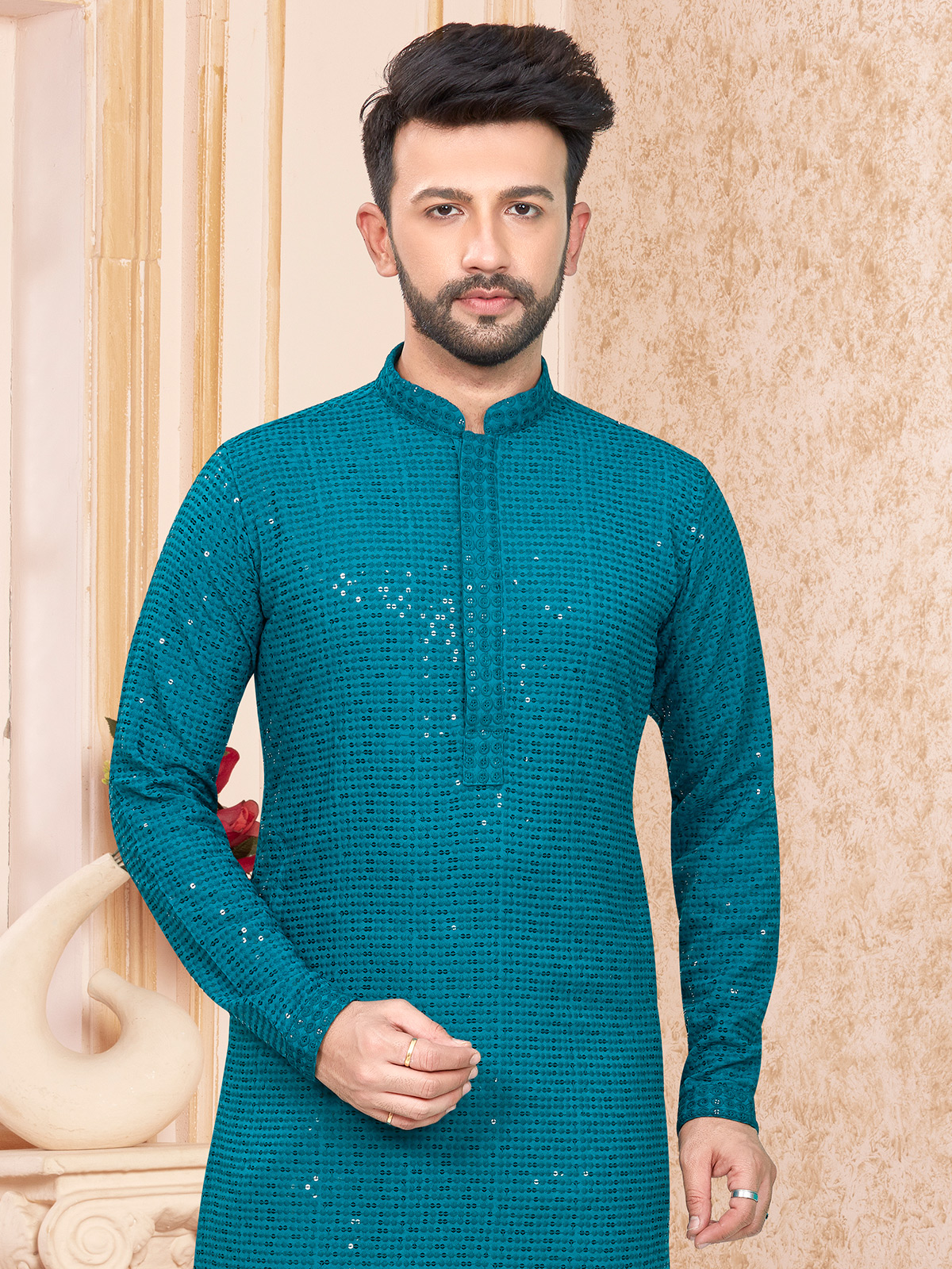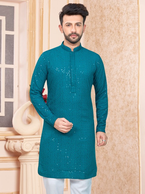 Stay comfortable and fashionable with this must have rama blue cotton kurta, enhnaced with embroidery, resham and sequins work. Designed with a mandarin collar and full sleeves.