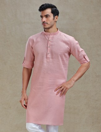 Embrace the festive season in our resplendent flamingo pink kurta for men. crafted on a luxurious linen base, this comfortable set is ideal for festive occasions, weddings, and family gatherings. paired with pants for ease of movement.