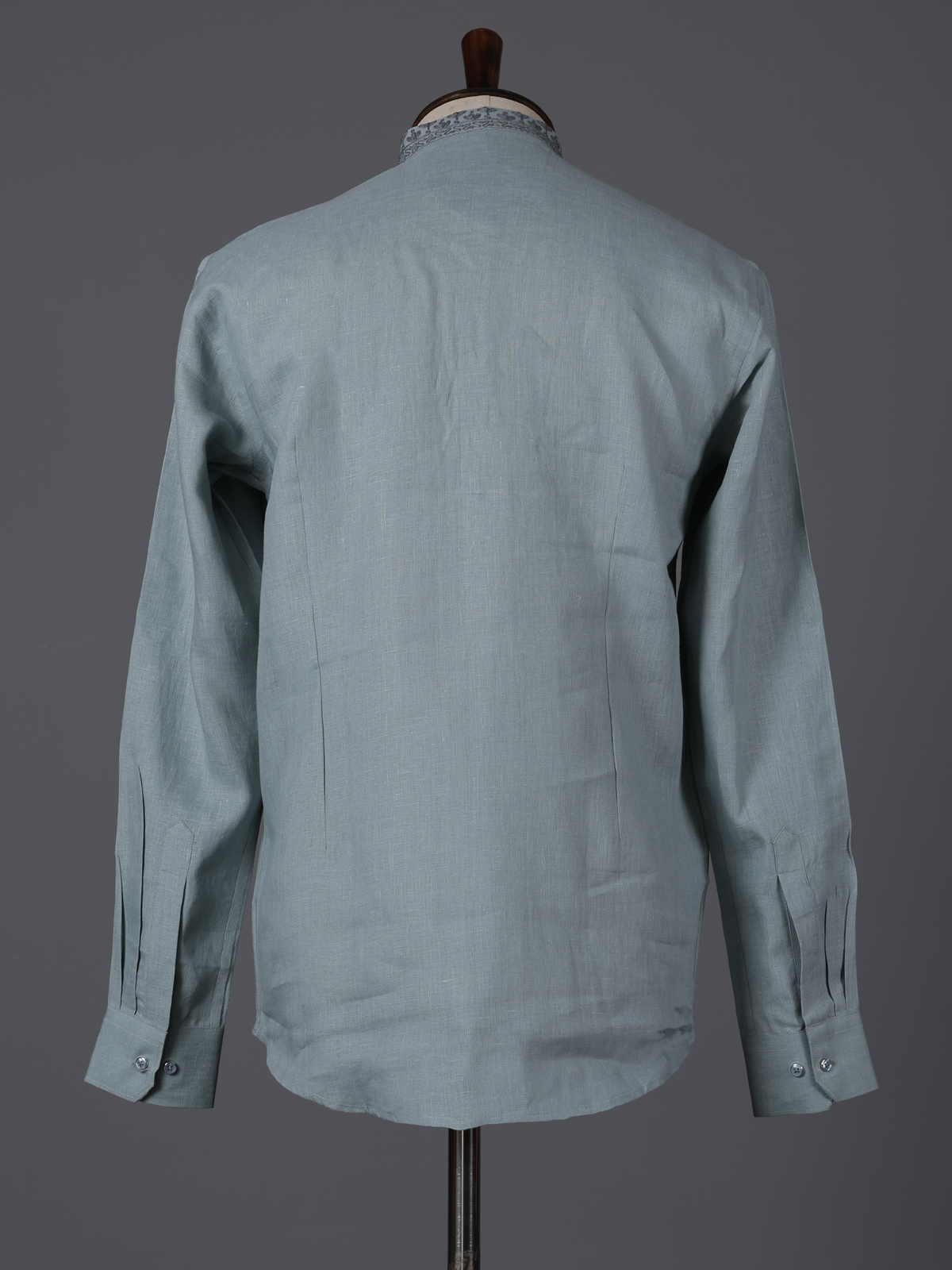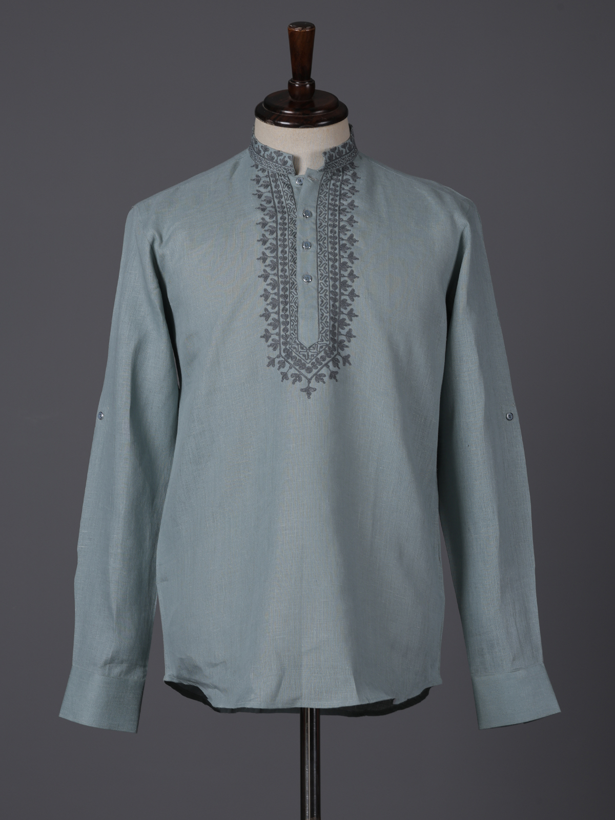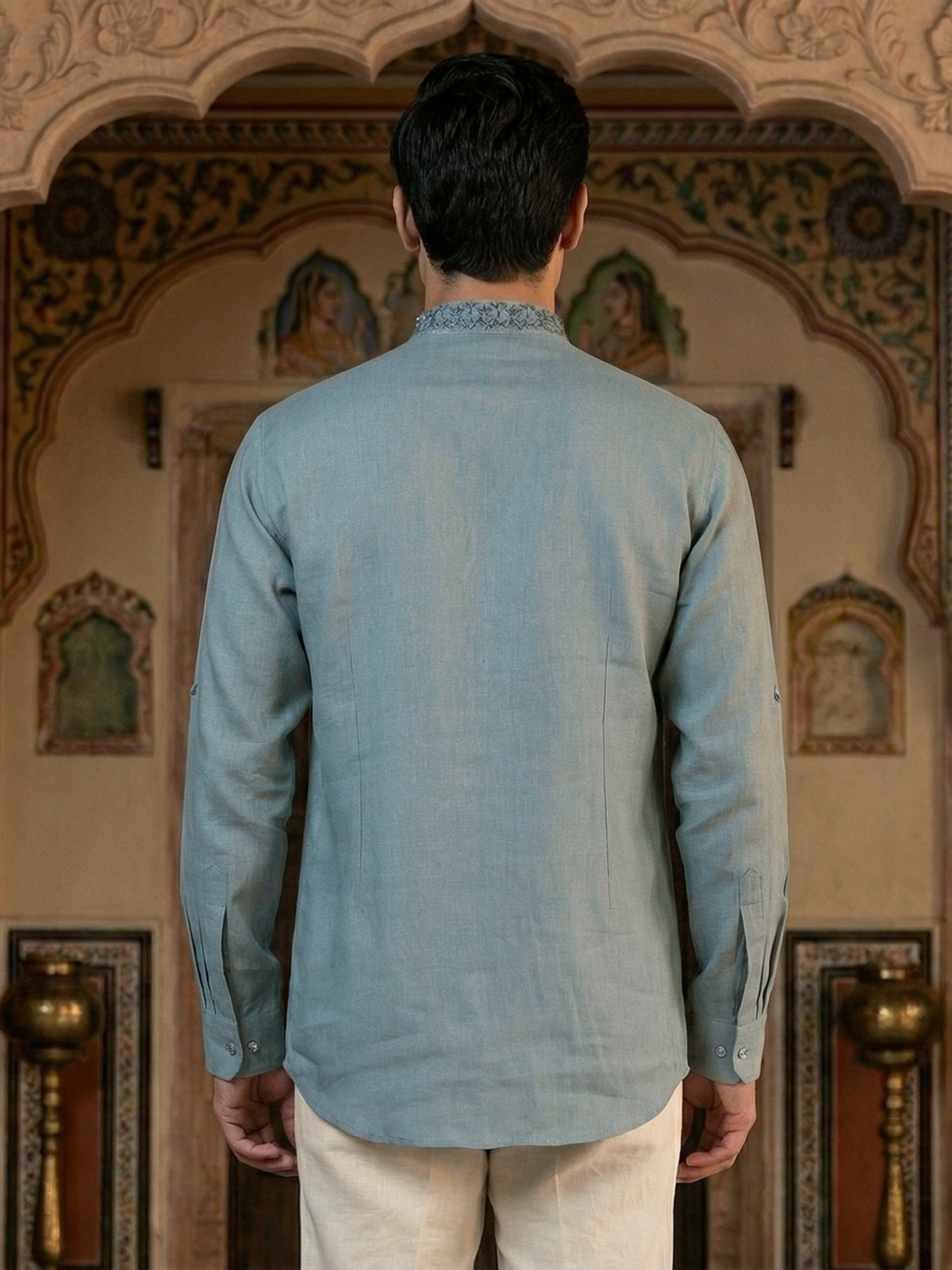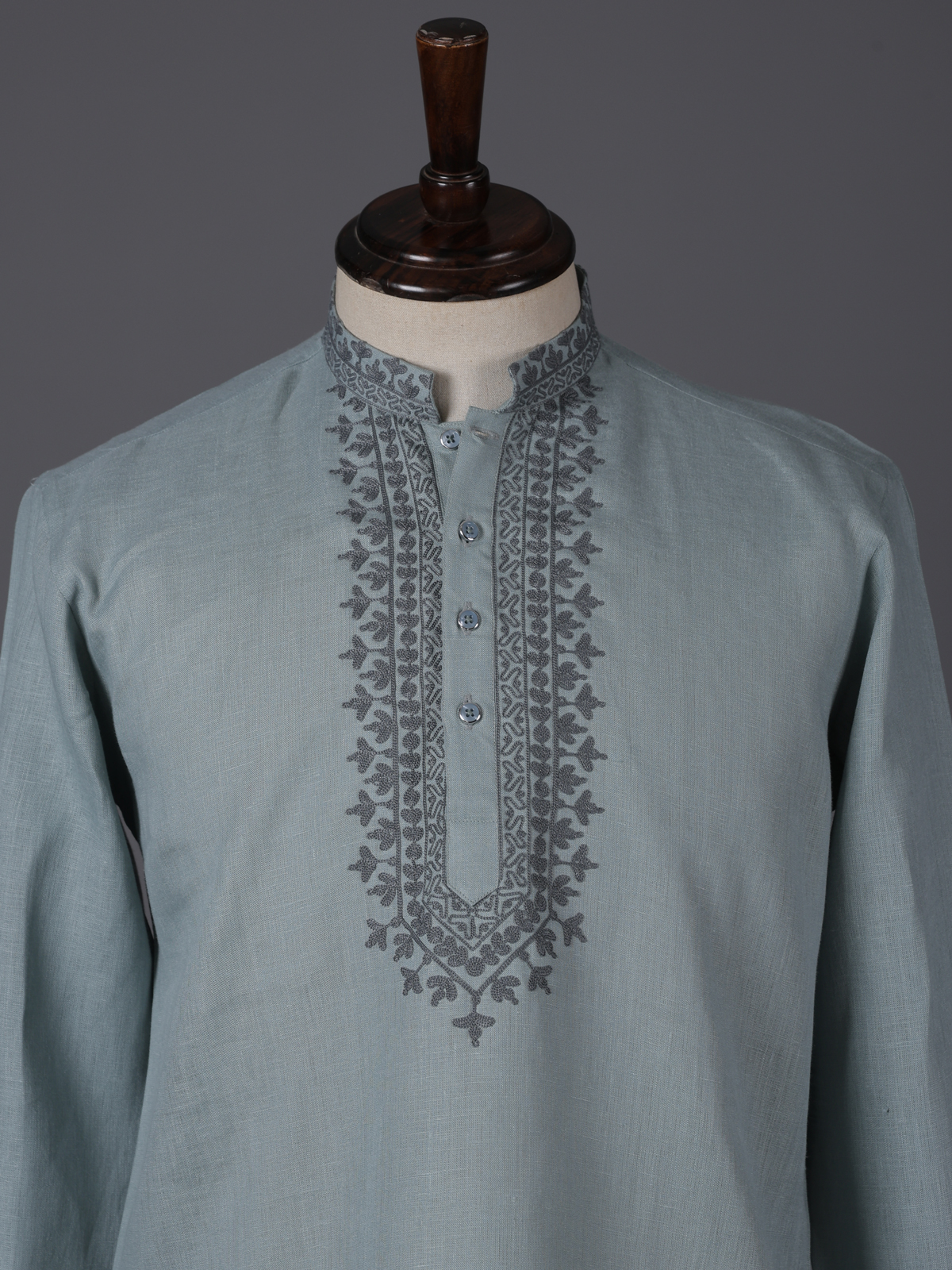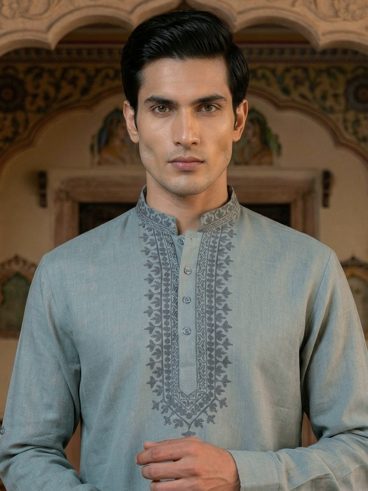 Refreshing light blue tones bring a calm elegance to this linen short pathani kurta. Detailed with fine embroidery. It reflects graceful craftsmanship. The chinese collar enhances its structured appeal. While the breathable fabric ensures comfort. Perfect for eid and festive gatherings. This kurta offers a soft and refined ethnic style.