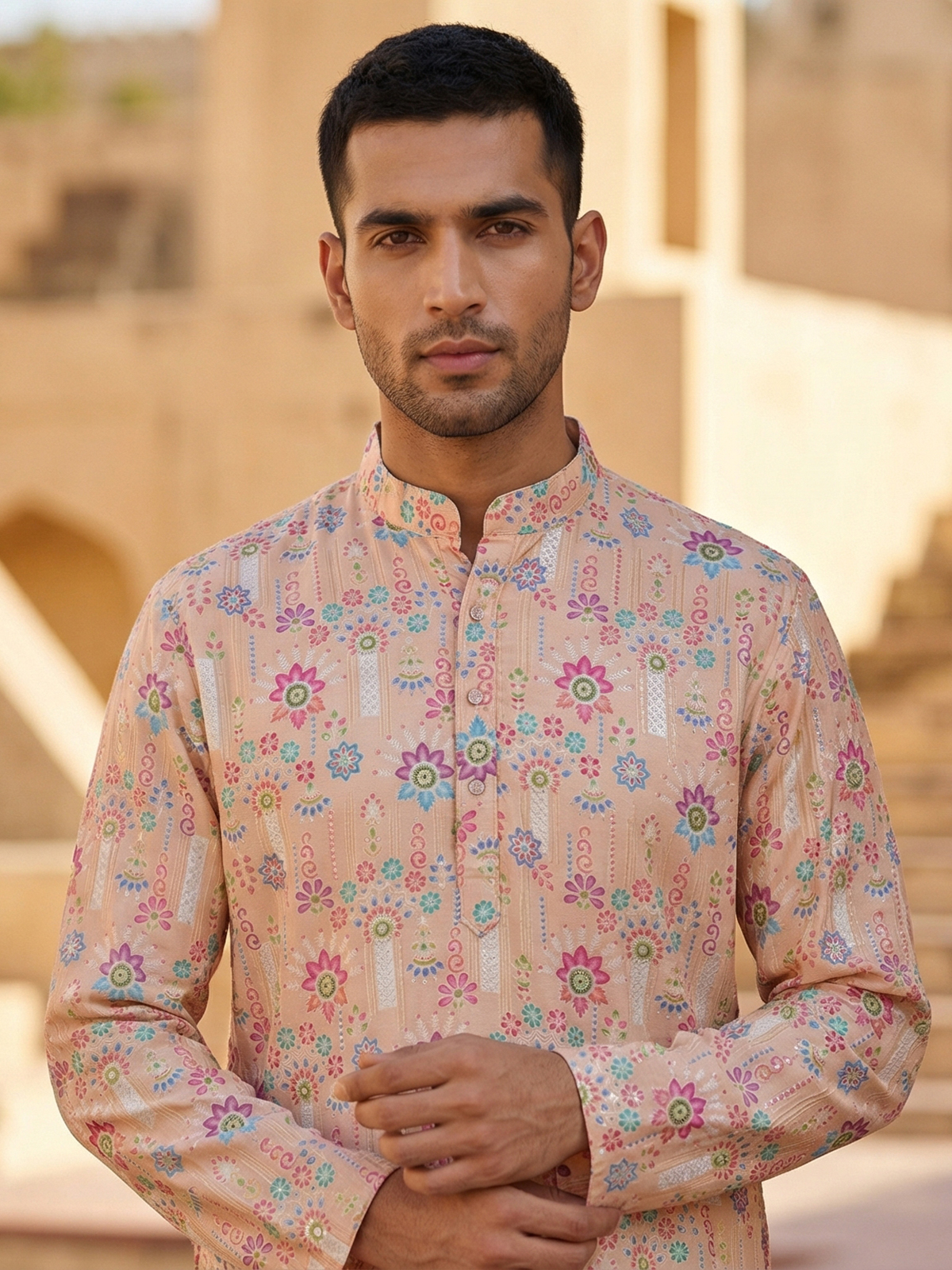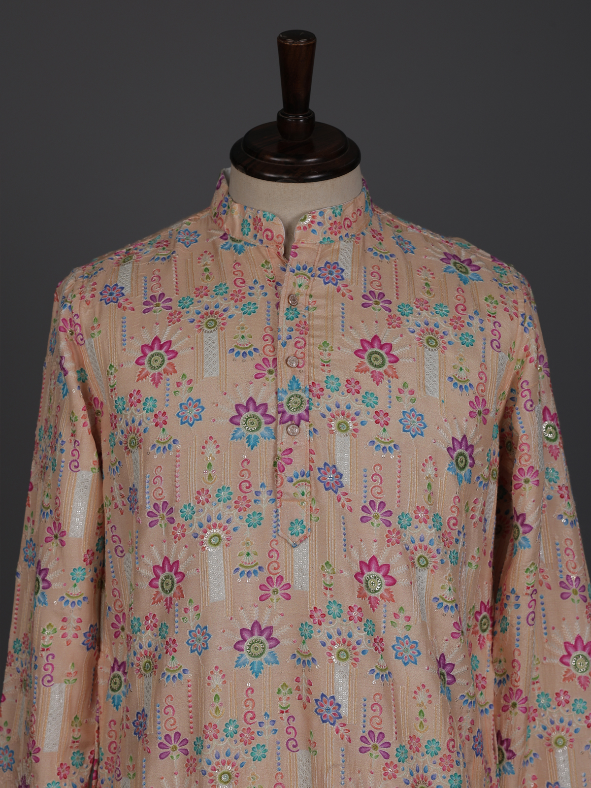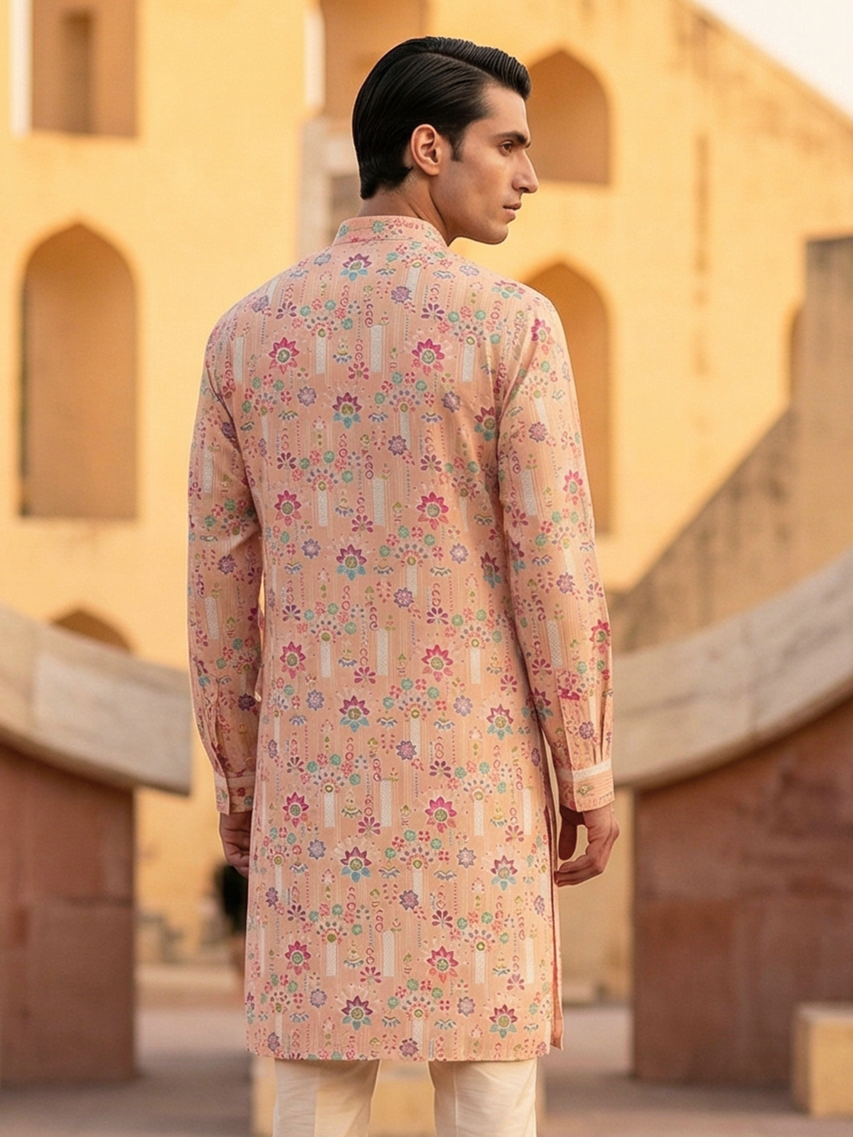 Soft light peach reflect delicate festive charm in this linen kurta crafted for elegant celebrations. Highlighted with printed designs and thread with sequin work. It adds gentle sparkle. The chinese collar enhances its polished silhouette. While the breathable fabric ensures ease. Ideal for sangeet and festive gatherings. This kurta blends comfort with graceful sophistication.