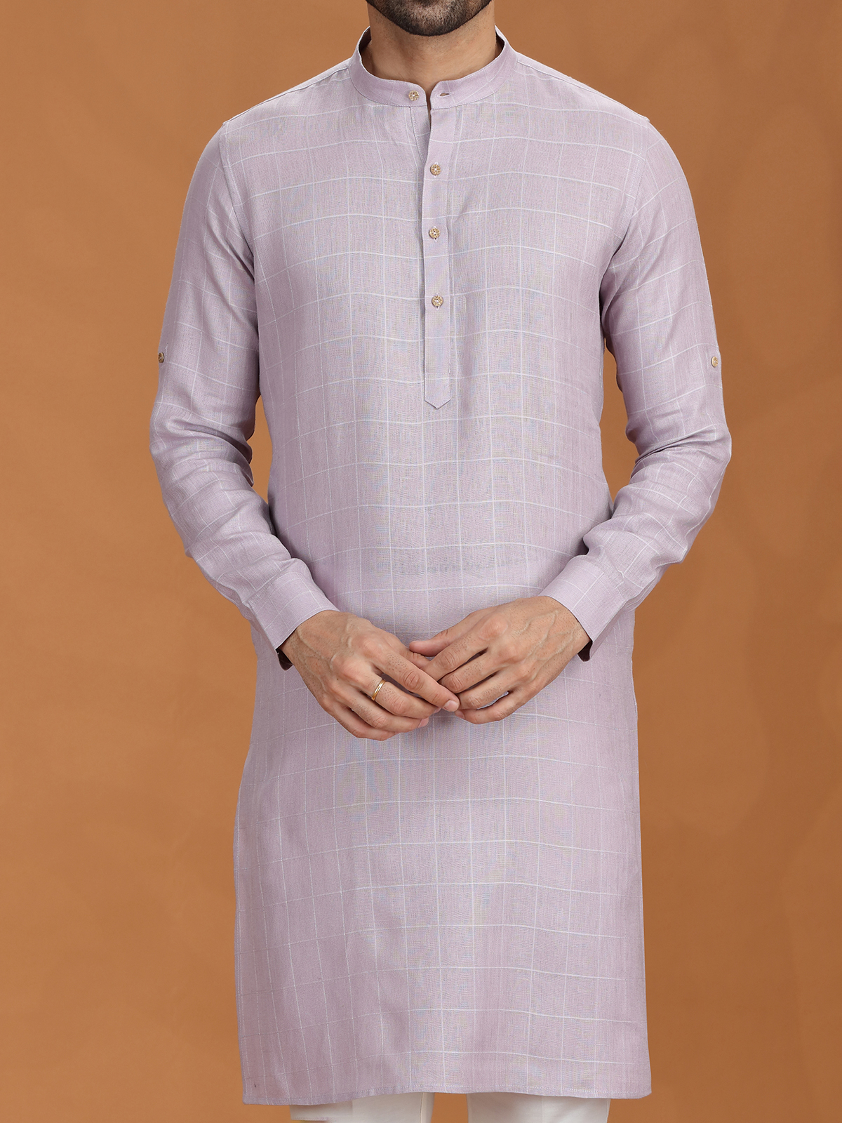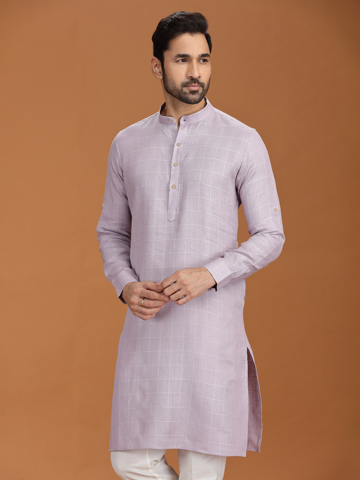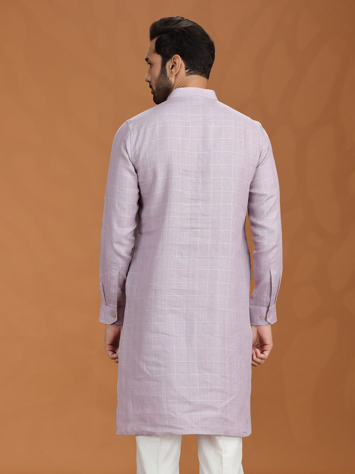 Lilac Purple Checked Linen Kurta For Gentlemen