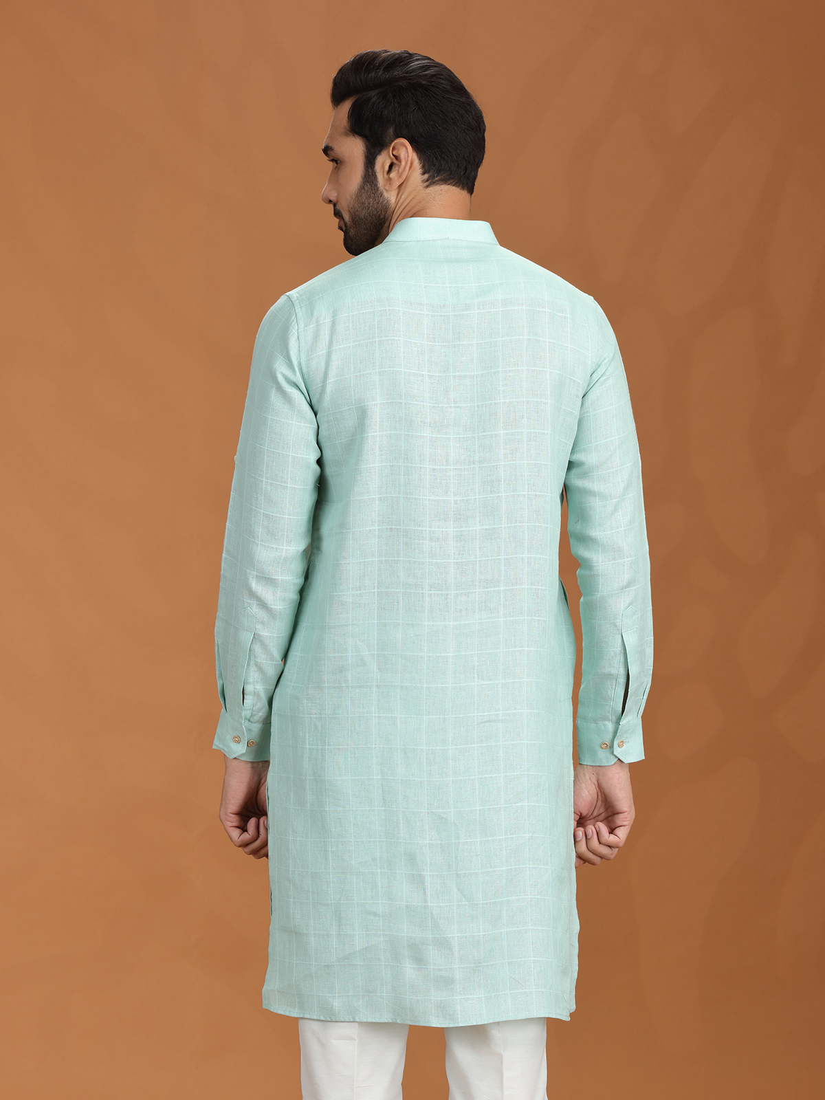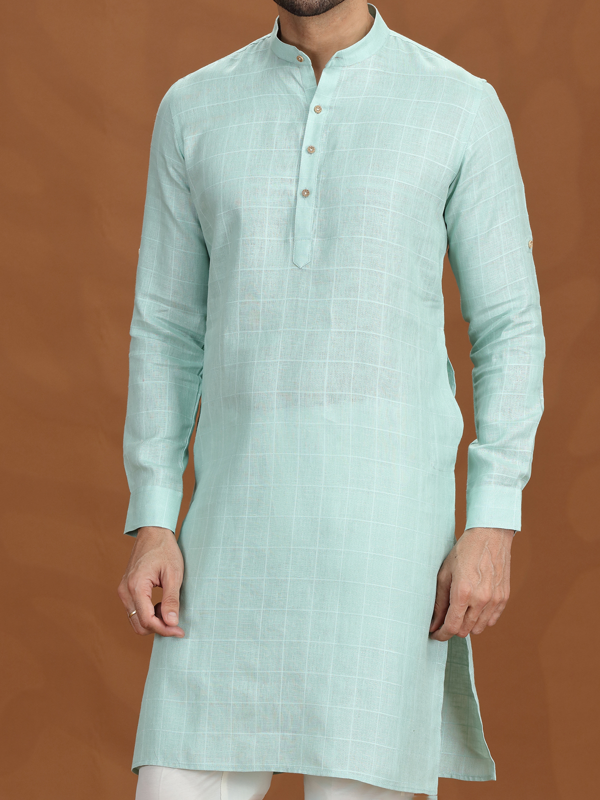 Infuse your festive wardrobe with the vibrant spirit of this lime green linen kurta. The checked design energizes its classic silhouette, while the Chinese collar and quarter sleeves offer a polished finish. A perfect match for daytime gatherings, rituals, or modern ethnic functions.