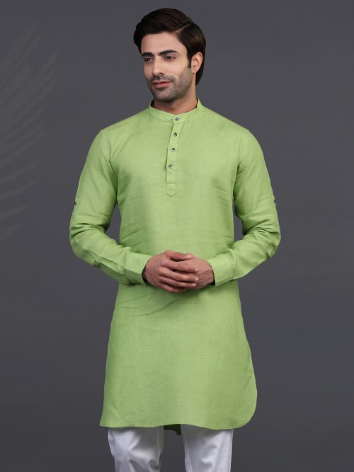 Introducing our ethnic collection featuring a stunning green linen kurta suit for festive occasions. The kurta boasts a stylish Chinese collar, half button placket, full sleeves and straight hemline.